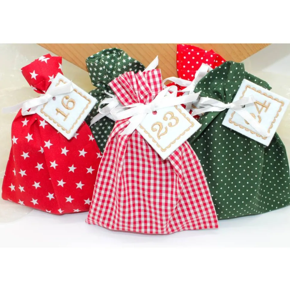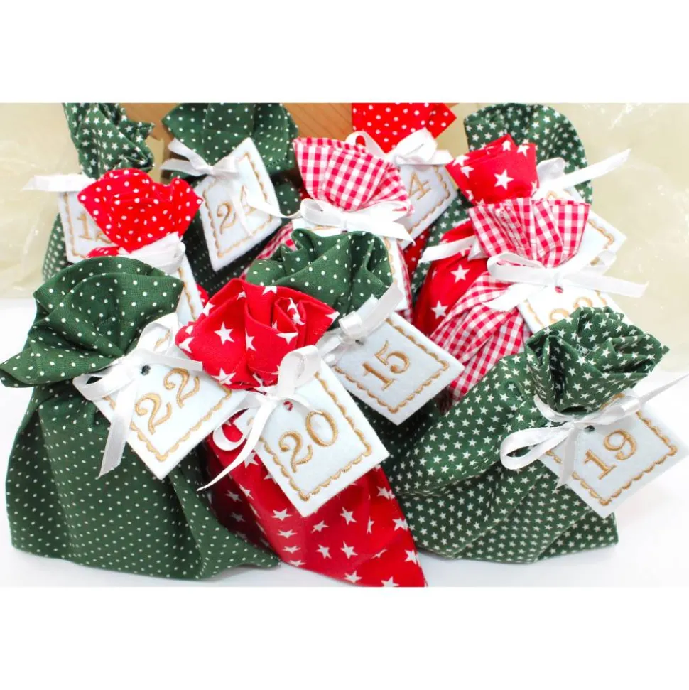 Das Set besteht aus 24 Säckchen in dunkelgrün rot, 24 bestickte Zahlen aus Filz und 24 Satinbändchen.