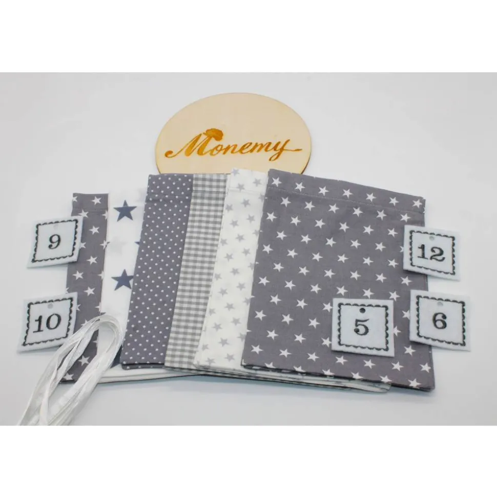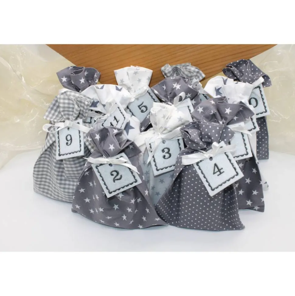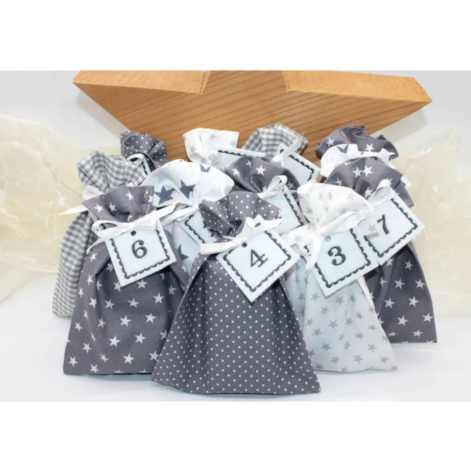 Das Set besteht aus 24 Säckchen, 24 bestickte Zahlen aus Filz und 24 Satinbändchen.