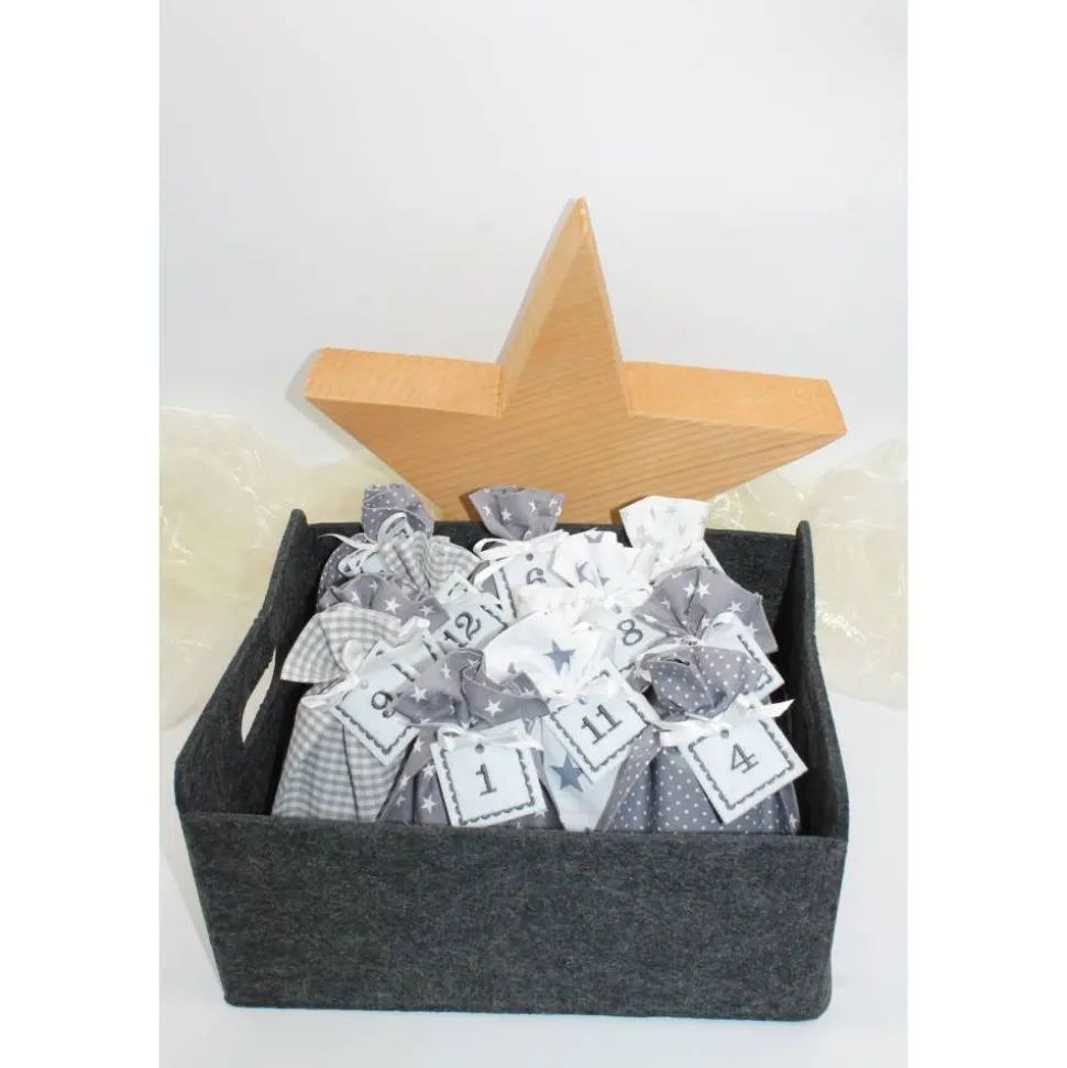 Die dunkelgraue Filzbox kann separat in meinem Shop erworben werden, auf Wunsch personalisiere ich diese auch. So haben die Säckchen ihren Platz in der Adventsbox.