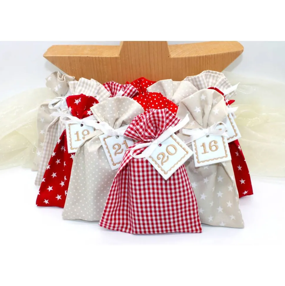 Das Set besteht aus 24 Säckchen (12x rot und 12x beige), 24 bestickte Zahlen aus Filz und 24 Satinbändchen.