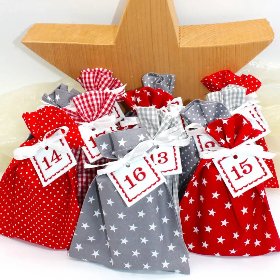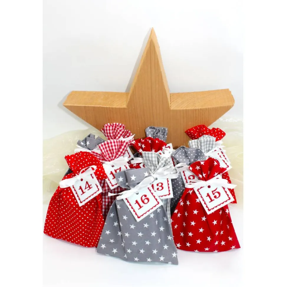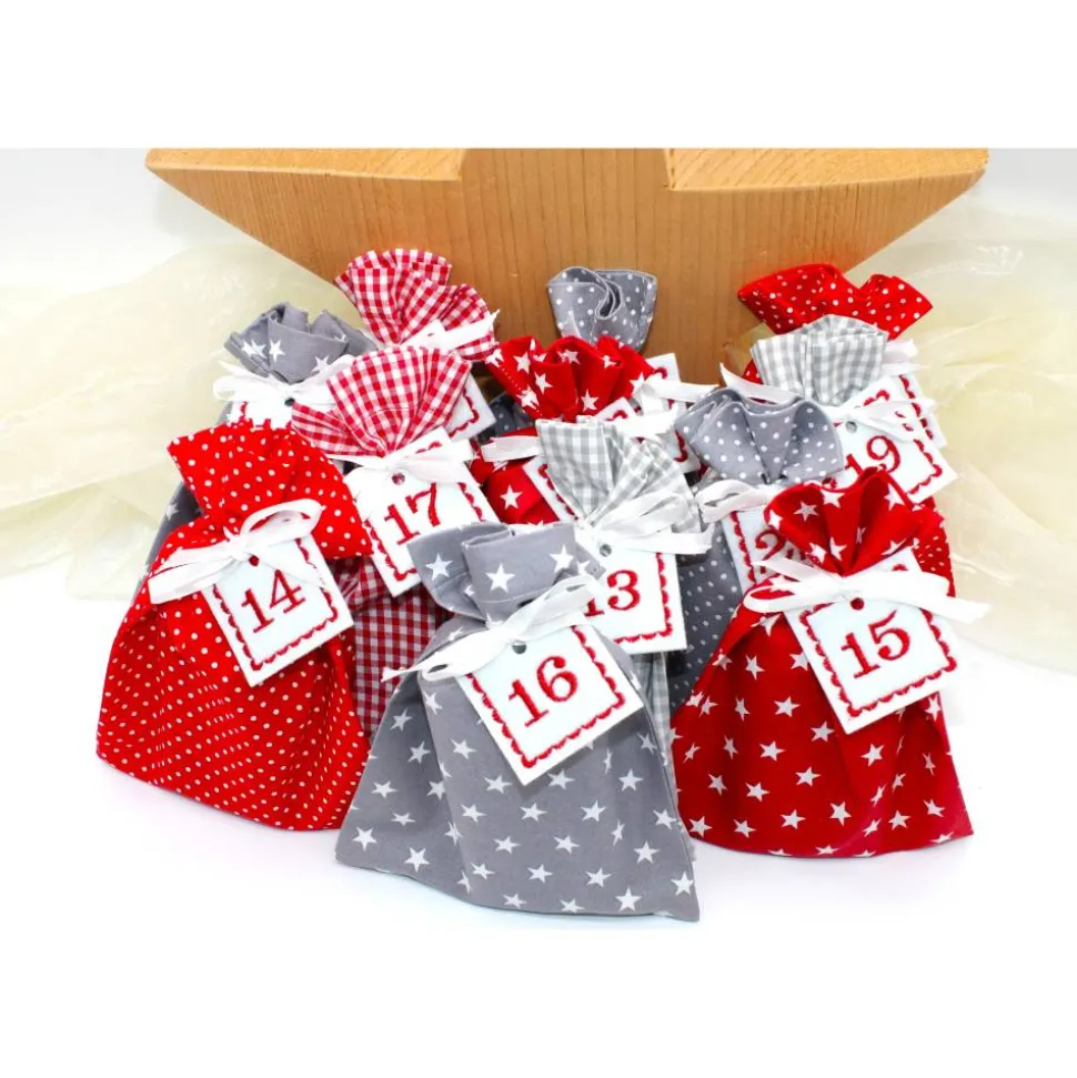 Das Set besteht aus 24 Säckchen (12x rote und 12x graue), 24 bestickte Zahlen aus Filz und 24 Satinbändchen.