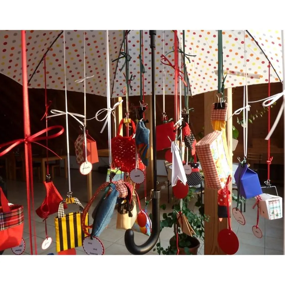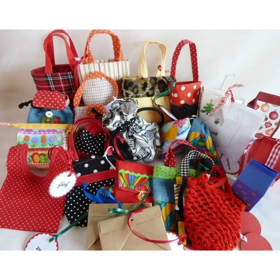 Die Täschchen, Pyramidentäschchen, der Rucksack und der Kulturbeutel sind mit Baumwollstoff abgefüttert, mit Volumen-und aufbügelbarer Vlieseline verstärkt, Beutel und Einkaufstaschen sind ungefüttert. Die Zahlen 1 – 24 sind nicht als Nummern sondern als Worte aufgedruckt und hängen an einem Organzaband welches an einer Maulyklammer angebracht ist.