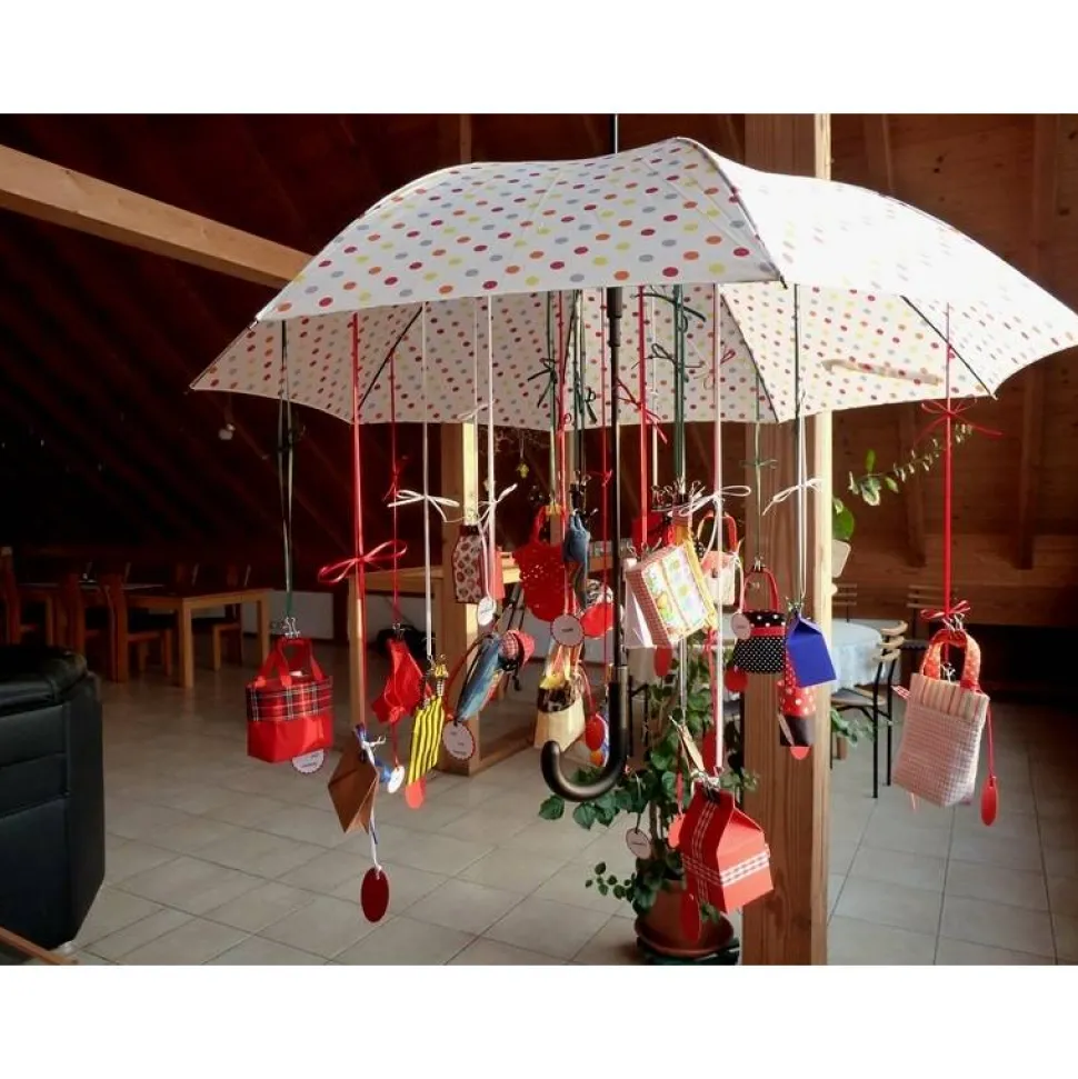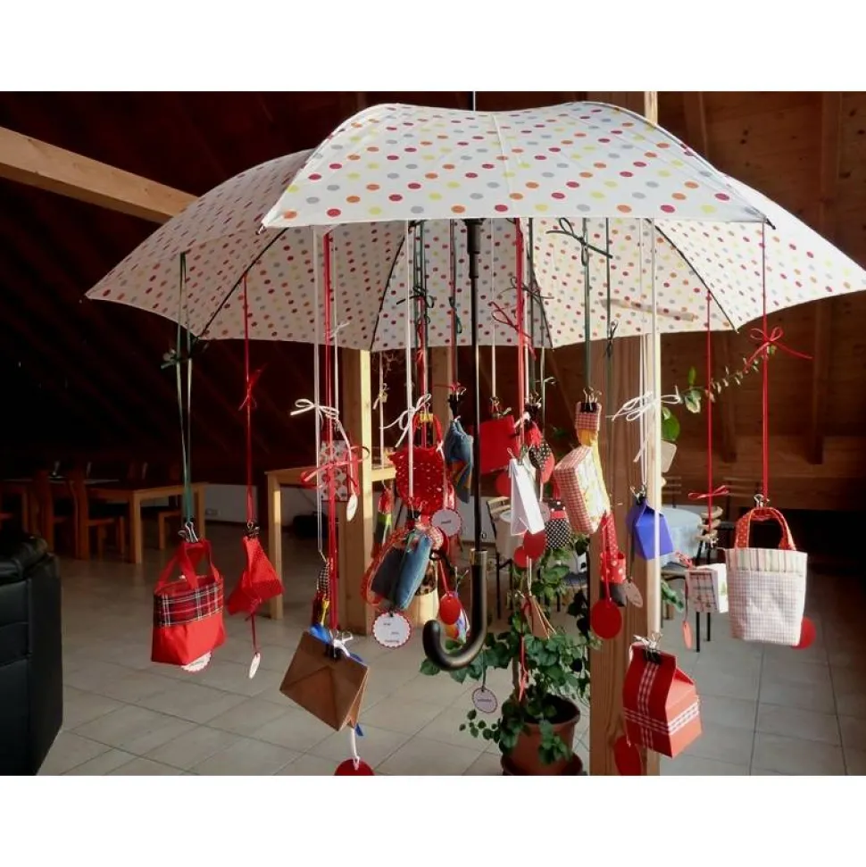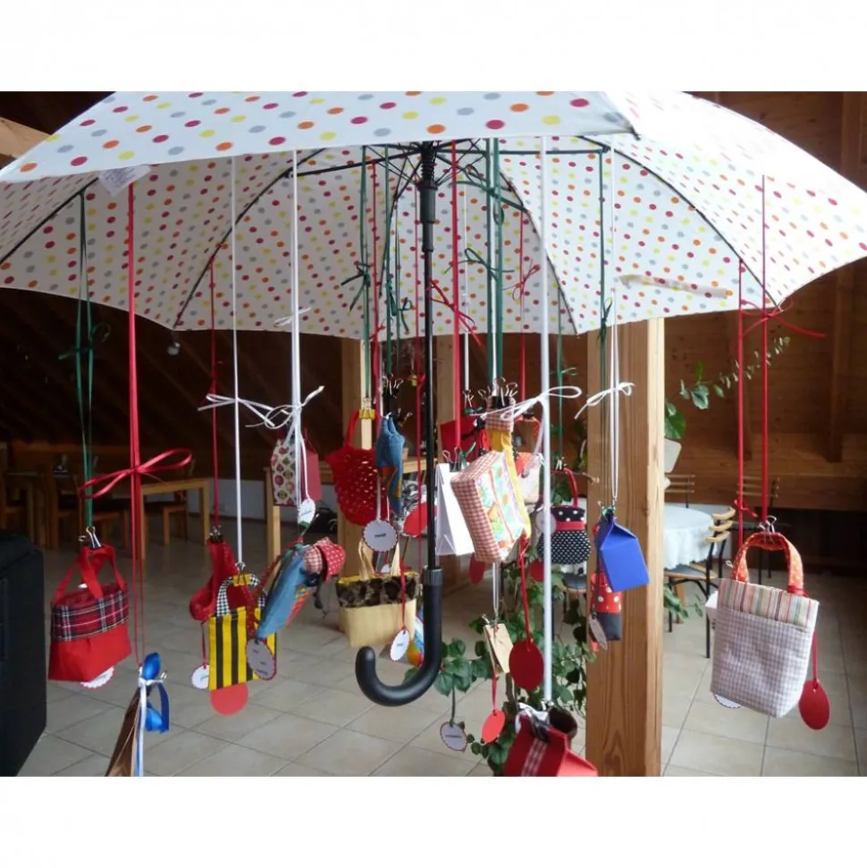 Die Taschen etc. sind an einem Automatikschirm aufgehängt der an einer Nylonschnur hängt in die ich mehrere Knoten angebracht habe, somit kann man mit der Aufhänghöhe variieren und es entsteht der Eindruck eines schwebenden Schirms.