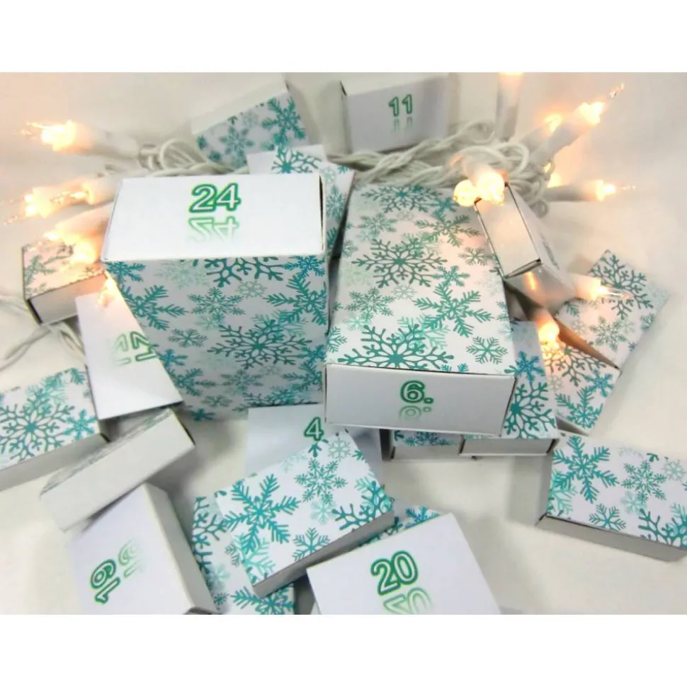 24x kleine plus 2 große Boxen. advent calendar, Eiskristall smaragd-grün auf weiß, Zahlen 1-24.