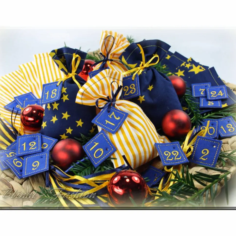 Wunderschöner Adventskalender bestehend aus 24 liebevoll in Handarbeit hergestellten Säckchen aus verschiedenen Baumwollstoffen. Zu den Adventskalendersäckchen bekommst du auch die auf Filz gestickten Adventskalenderzahlen und Satinband zum Binden.