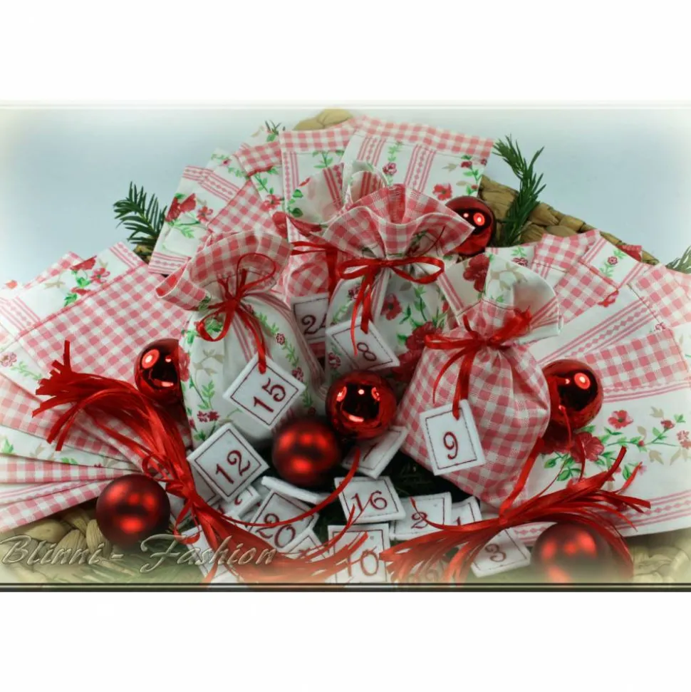 Wunderschöner Adventskalender bestehend aus 24 liebevoll in Handarbeit hergestellten Säckchen aus verschiedenen Baumwollstoffen. Zu den Adventskalendersäckchen bekommst du auch die auf Filz gestickten Adventskalenderzahlen und Satinband zum Binden.