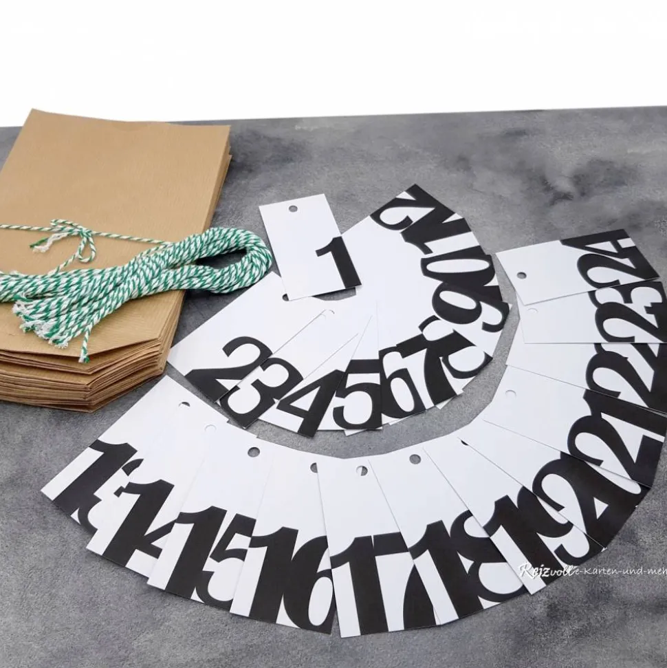 Im Set enthalten sind 24 Kraftpapier-Bodenbeutel (ca. 14 x 19 cm), 24 Zahlenanhänger in stilvollem Schwarz-Weiß sowie 24 grün-weiße Kordeln (je ca. 36 cm). Fülle die Beutel mit kleinen Geschenken und befestige die Anhänger – schon ist dein Adventskalender fertig!
