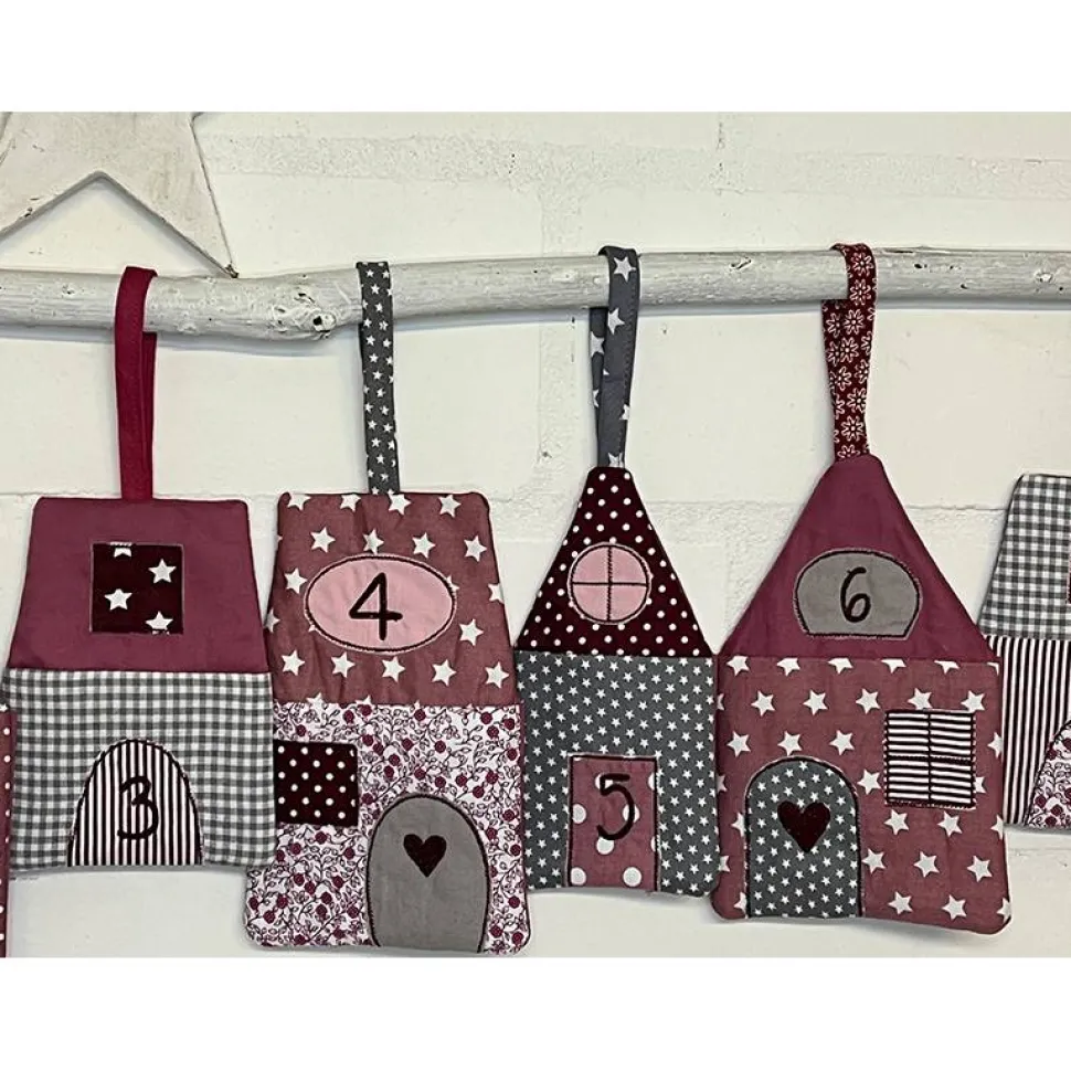 Dieser Adventskalender besteht aus 24 genähten „Häuschen“, die aufwendig bestickt in bordeaux, mit Zahlen versehen und verziert worden sind. Die Stoffe sind alles hochwertige Baumwollstoffe, mit Vlies hinterlegt zur besseren Stabilität mit den verschiedenensten Mustern , alles in grau-bordeaux-rosa gehalten. Hinten an dem Häuschen ist eine kleine Tasche zu befüllen, mit Süßigkeiten, kleinen Geschenken, Loosen, Pflegeprodukten, Briefchen oder was auch immer. Die Rückseite ist immer aus beerenfarbenen Stoff. Mit dem angenähten Band können die Häuschen überall aufgehängt werden, an einer Leine, am Treppengeländer, an einem schönem Ast , die Möglichkeiten sind unbegrenzt. Jedes Häuschen ist unterschiedlich und auch kein Kalender ist gleich, alles Unikate. Die Stoffe auf den Fotos können varieren, ergeben aber immer den gleiche harmonischen Gesamteindruck.