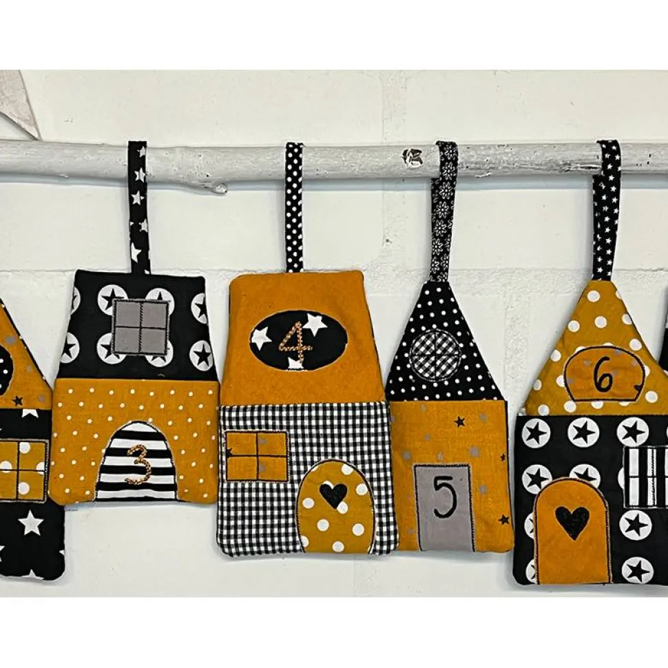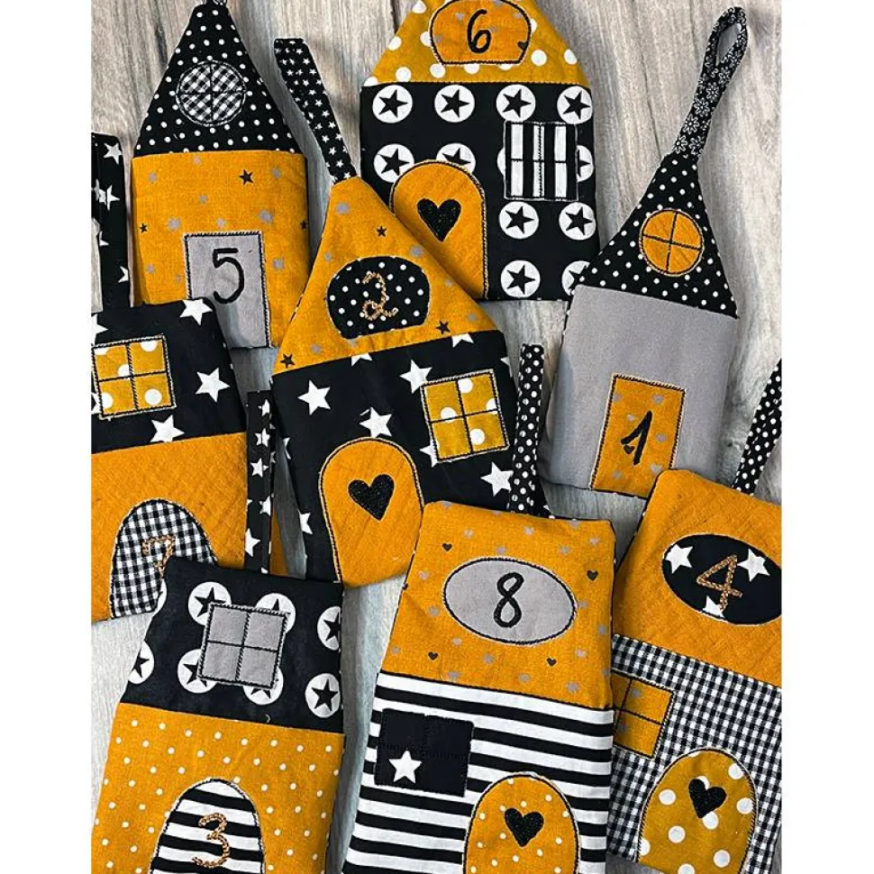 Dieser Adventskalender besteht aus 24 genähten „Häuschen“, die aufwendig bestickt in schwarz oder senf, mit Zahlen versehen und verziert worden sind. Die Stoffe sind alles hochwertige Baumwollstoffe, mit Vlies hinterlegt zur besseren Stabilität mit den verschiedenensten Mustern , alles in senf-schwarz-weiß-grau gehalten. Hinten an dem Häuschen ist eine kleine Tasche zu befüllen, mit Süßigkeiten, kleinen Geschenken, Loosen, Pflegeprodukten, Briefchen oder was auch immer. Die Rückseite ist immer aus schwarz-weiß klein gepunktetem Stoff. Mit dem angenähten Band können die Häuschen überall aufgehängt werden, an einer Leine, am Treppengeländer, an einem schönem Ast , die Möglichkeiten sind unbegrenzt. Jedes Häuschen ist unterschiedlich und auch kein Kalender ist gleich, alles Unikate. Die Stoffe auf den Fotos können varieren, ergeben aber immer den gleiche harmonischen Gesamteindruck.