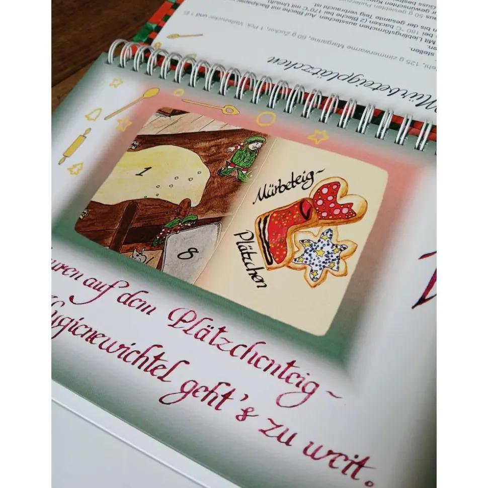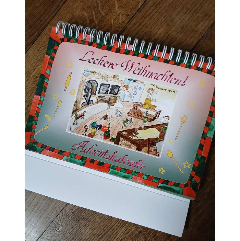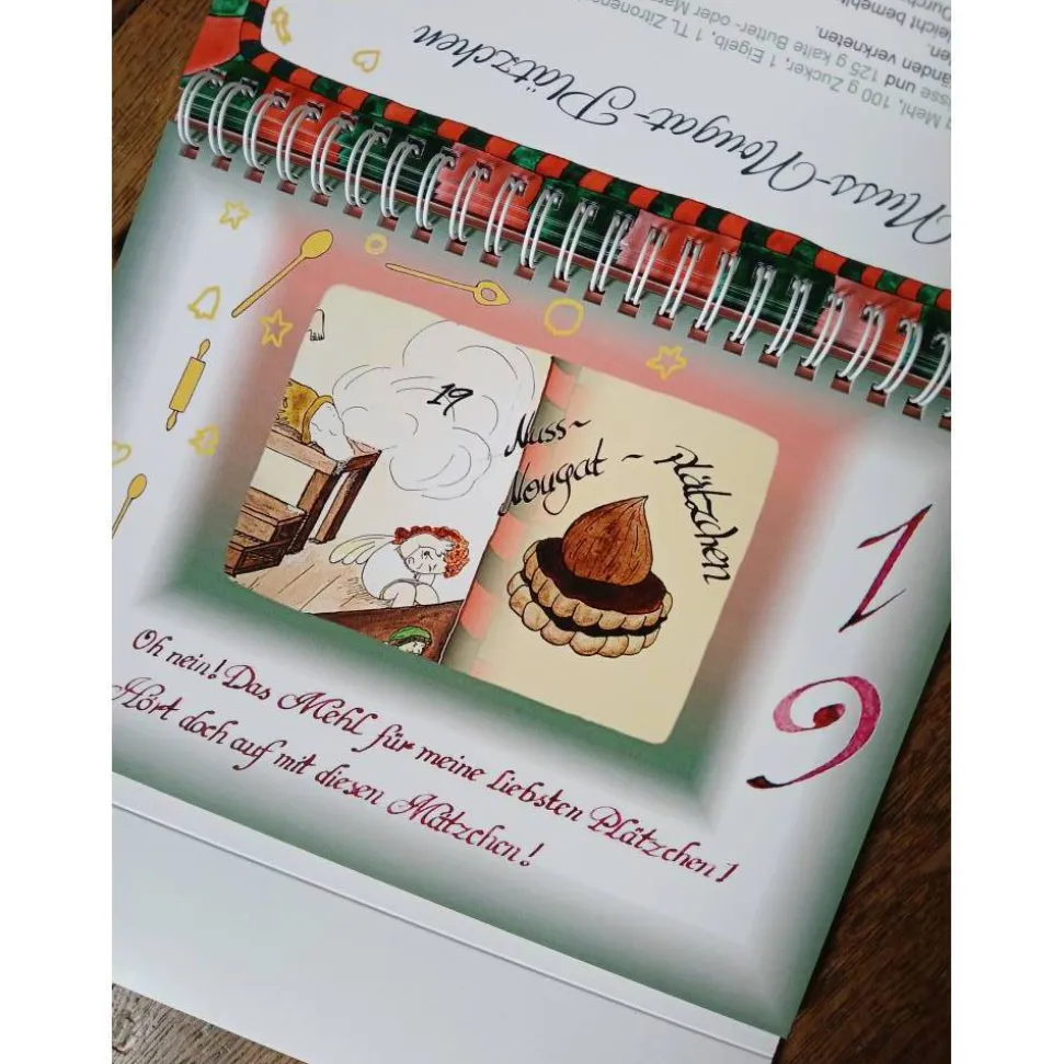 Jeden Tag darf eine neue Seite vom Kalender umgeblättert werden. Zu sehen ist ein vergrößerter Bildausschnitt und eine Weihnachtsleckerei. Das entsprechende Rezept ist auf der Rückseite des Kalenders aufgeschlagen.