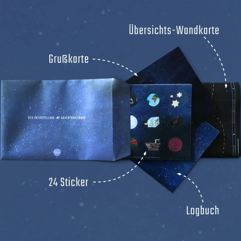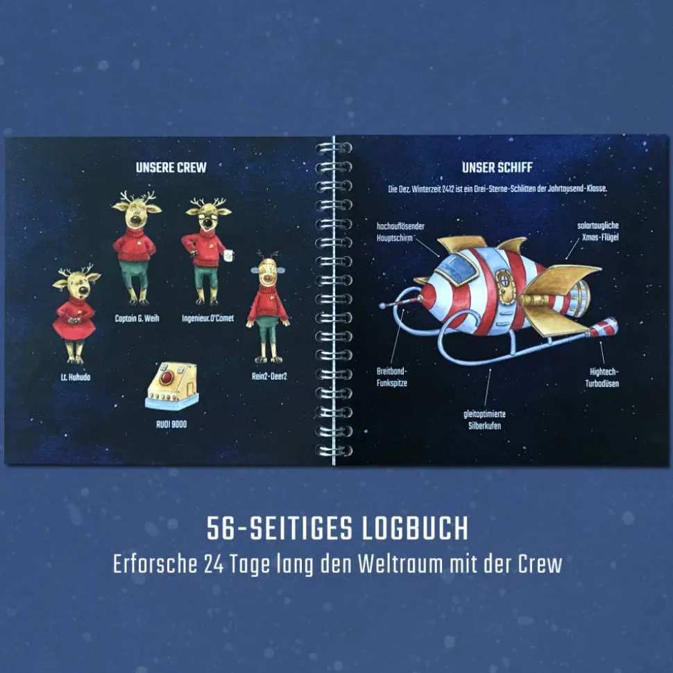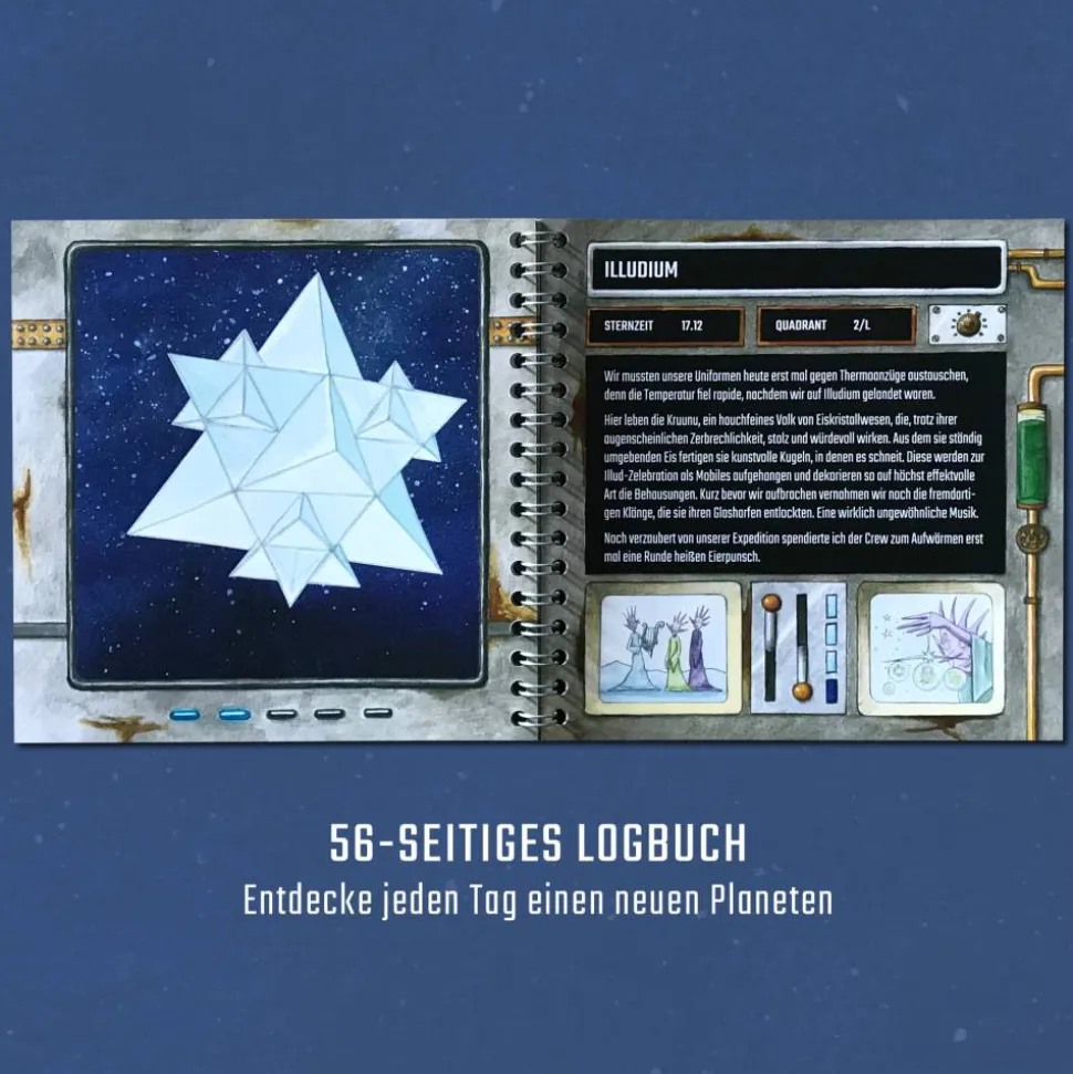 Begleite Captain G. Weih und seine Crew 24 Tage lang auf ihrer Reise durch die Tiefen der Galaxie. Erfahre täglich aus dem Logbuch wie fremde Lebensformen ihre Feste feiern und ihre Bräuche begehen und markiere die entdeckten Planeten mit den Stickern auf der großen Übersichts-Wandkarte.