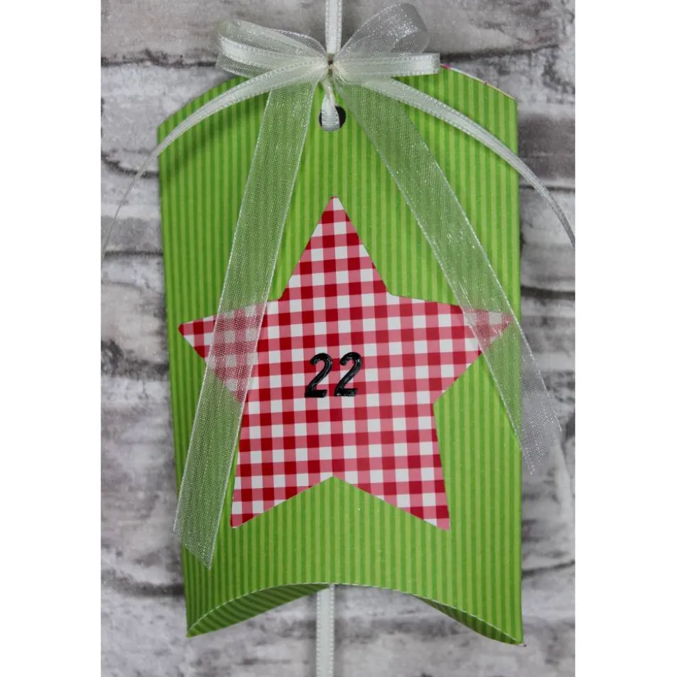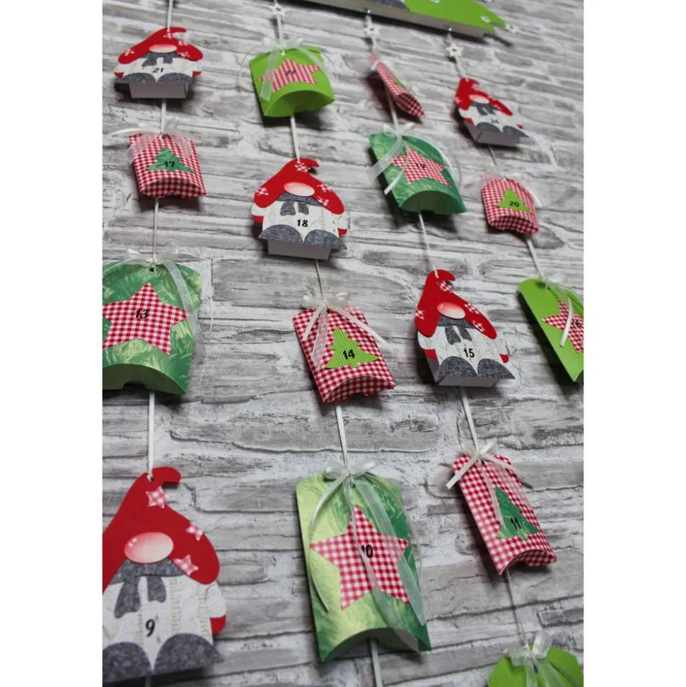 Je nach Bestand können kleine Details wie Schmucksteine, Schleifenband, Zahlen usw. in Art und Farbe variieren, aber immer passend zum Adventskalender.