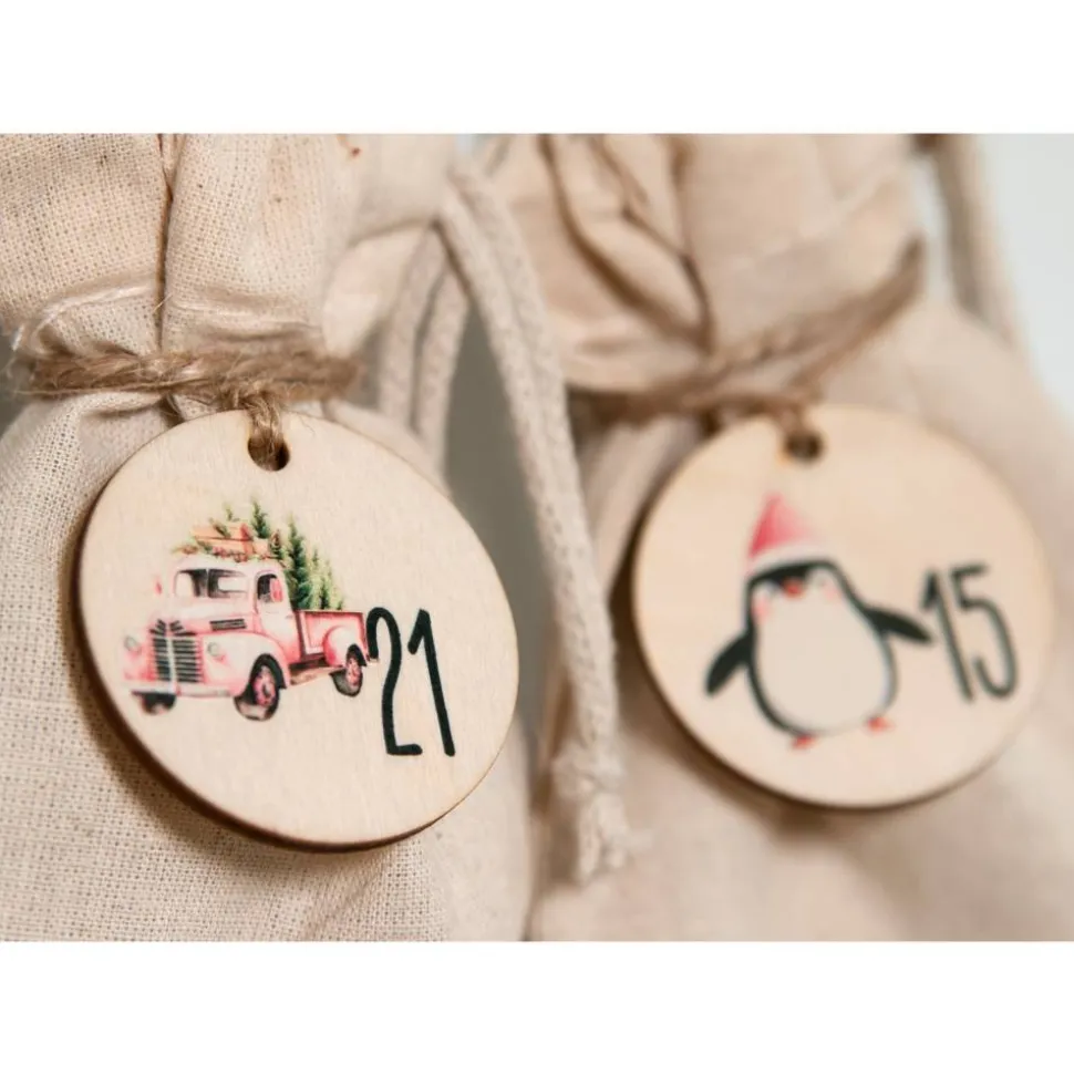 • 24 runde Holzanhänger (Zahlen 1–24) mit „Pink Christmas“-Motiven