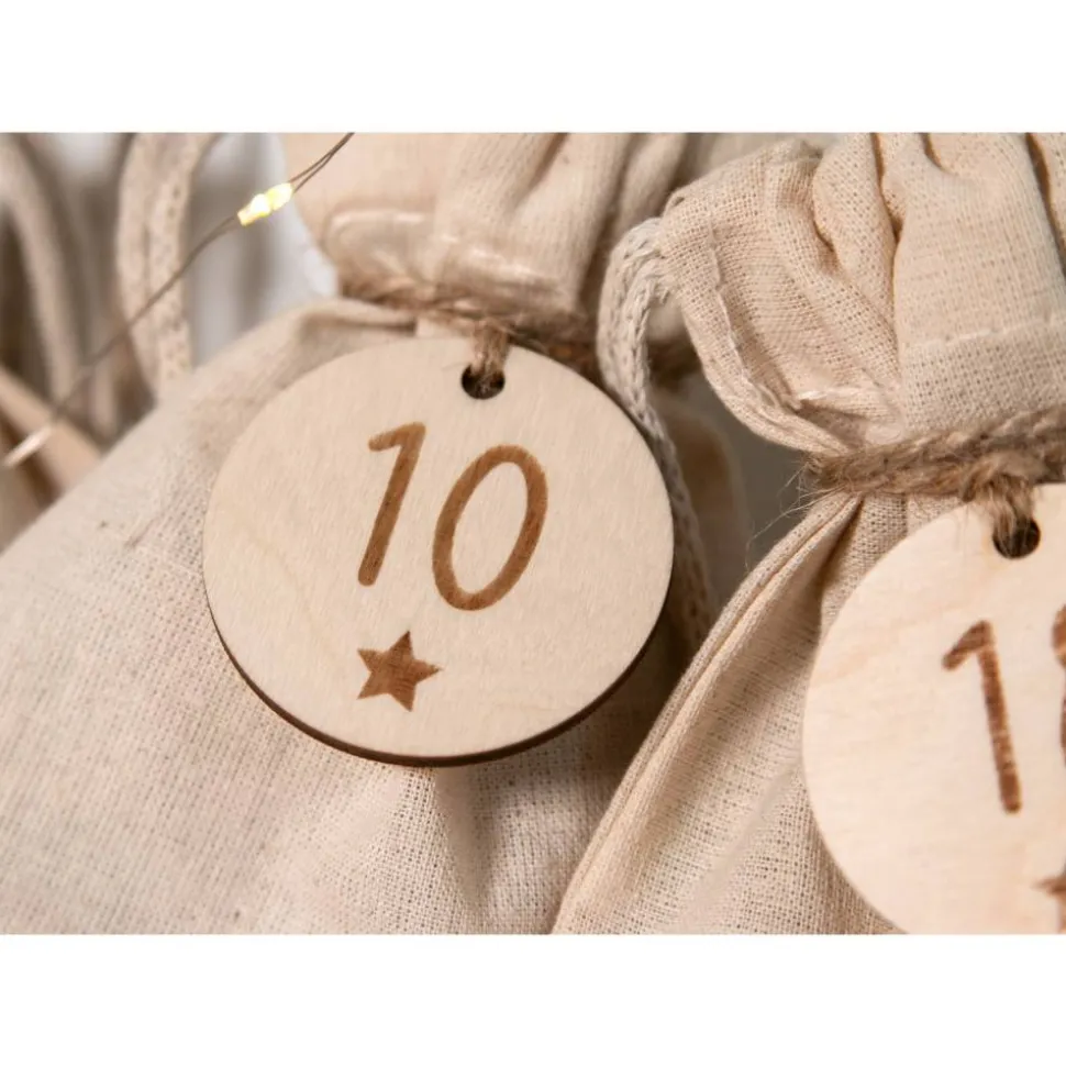 - 24 runde Holzanhänger, nummeriert 1–24, mit Stern-Gravur