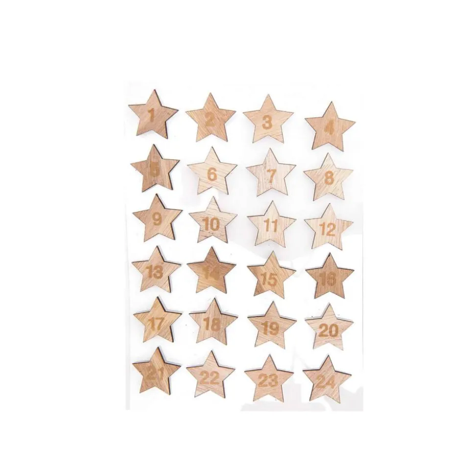 Schöne Sternen-Sticker für den selbstgemachten Adventskalender. Die Holzsterne können direkt auf Geschenkschachteln oder Anhänger geklebt werden.