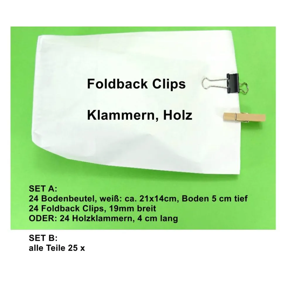 – 24 Foldback Clips, Breite ca. 19mm _ODER_ 24 Holzklammern, ca. 4cm lang