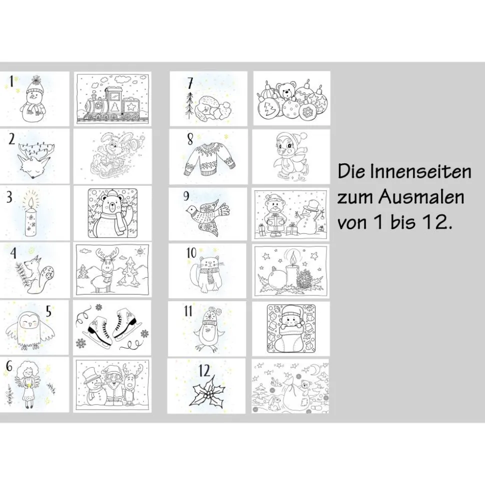 Der Adventskalender zum Ausmalen im DIN A5 Format ist etwas Besonderes. Er ist ein kreativer Begleiter durch die zauberhafte und magische Vorweihnachtszeit. Eigentlich habe ich ihn für Kinder entworfen, aber natürlich „dürfen“ sich auch Erwachsene daran erfreuen.