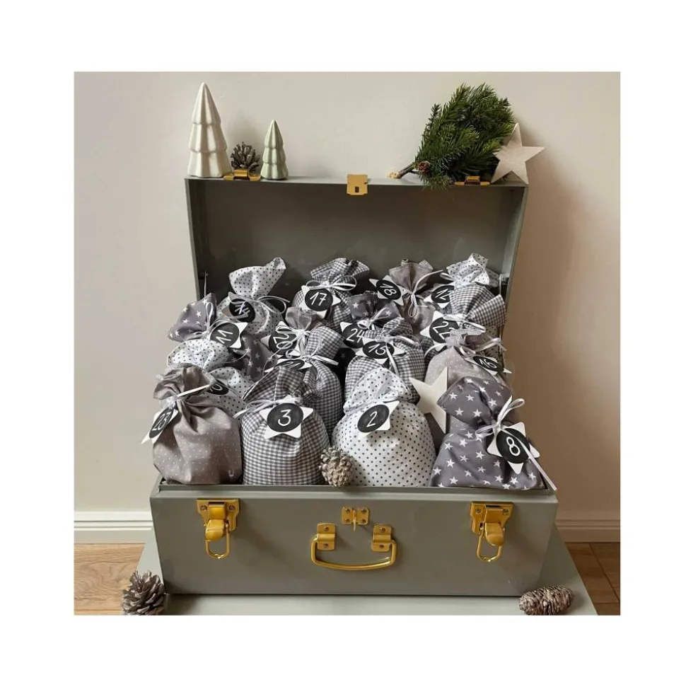 Die 24 Säckchen unseres Adventskalender zum Befüllen in XL bieten mit 15×20 cm reichlich Platz zum Verstauen kleiner Geschenke und Leckereien. Die Tütchen haben ein eingenähtes Satinband zum Verschließen, dass somit nicht verloren gehen kann. Jeweils sechs Säckchen sind im gleichen Muster genäht. Zum Lieferumfang gehören zusätzlich 24 Pappsterne aus Kraftpapier mit Loch zum Einfädeln des Satinbands und 24 Zahlenaufkleber.