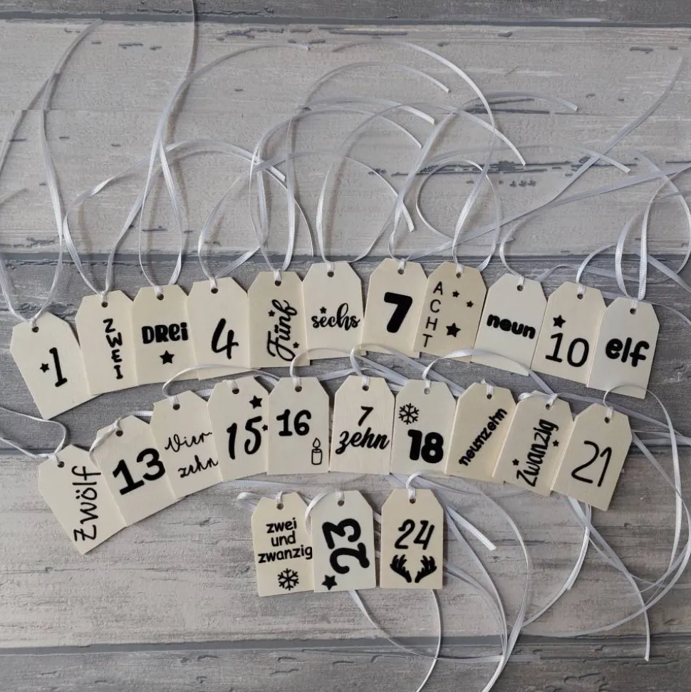Adventskalender zum Befüllen aus hochwertigen Baumwollstoffen bringt dir eine liebevolle Verpackung für kleine Überraschungen in der Adventszeit. Die 24 Säckchen sind sorgfältig genäht, innen versäubert und oben gesäumt. Sie lassen sich mit einem Satinband einfach verschließen und sind mit dekorativen Holzanhängern versehen, auf die die Zahlen mit Flockfolie aufgebracht wurden.