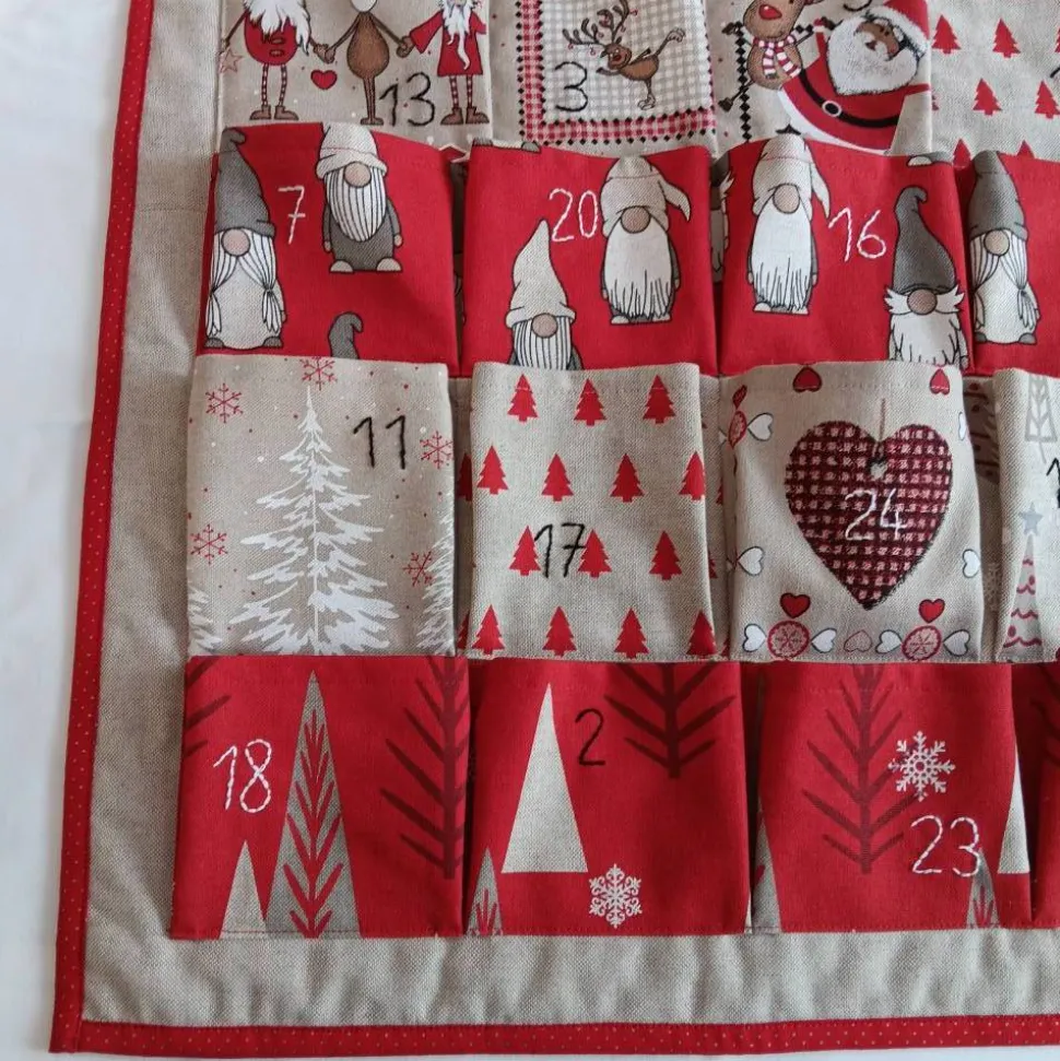 Dieser tolle Adventskalender ist ein echtes Schmuckstück. Wichtel tanzen mit Rentieren durch den Wald. Die vielen aufgenähten Täschchen aus unterschiedlichen Stoffen können nach Belieben selbst mit Süßem, Gutscheinen oder sonstigem befüllt werden. Sie haben eine Größe von 10 cm x 8cm (in der Mitte des Wandbehangs) bis 12 cm x 11 cm. Die Nummern sind von Hand mit Sticktwist aufgestickt. Der Hintergrund besteht aus beigem Stoff in Leinenoptik, der mit einer dünnen Lage Volumenvlies gepolstert ist. Die schöne Kante ist rundum mit rotem Baumwollstoff mit goldenen Pünktchen eingefasst. Auf der Rückseite ist oben ein Stofftunnel angenäht, durch den eine Stange zum Aufhängen geschoben werden kann (die Stange gehört nicht zum Lieferumfang). Zusätzlich gibt es 2 Metalösen, an denen man diesen hochwertigen Adventskalender alternativ aufhängen kann. Ohne Deko.