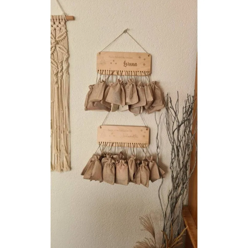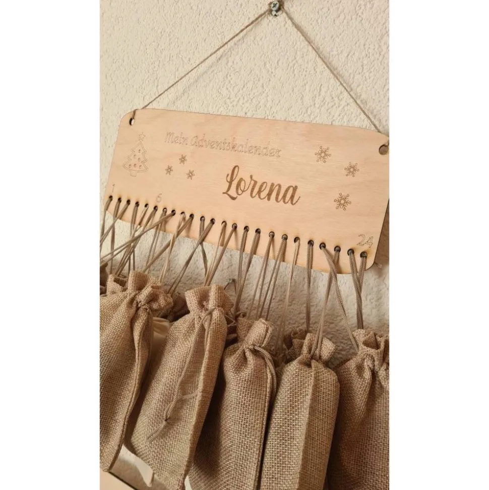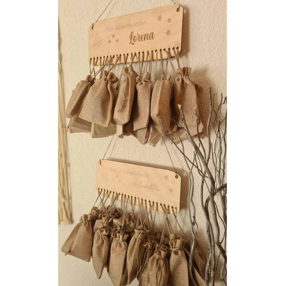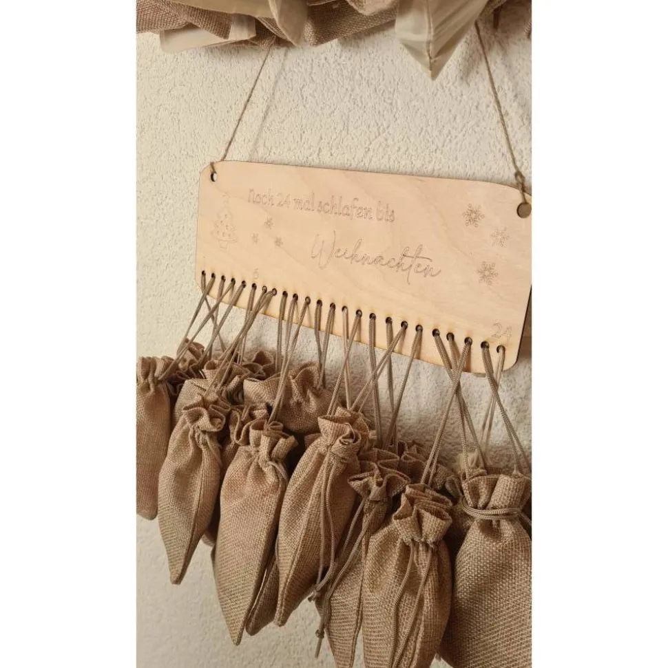 Der Kalender ist aus Holz und hat eine Größe von 29cm x 12cm (ohne hängende Säckchen).