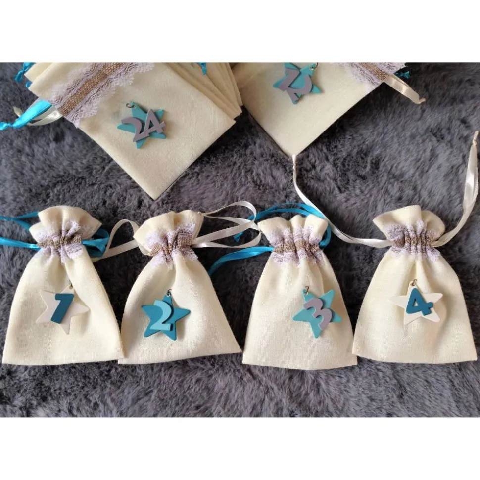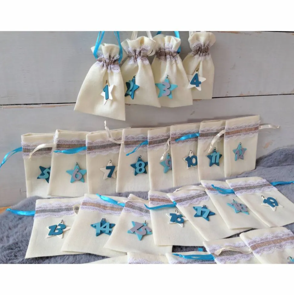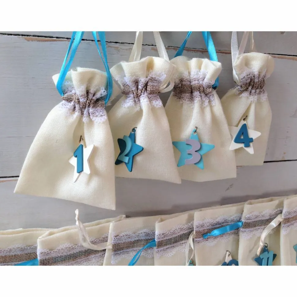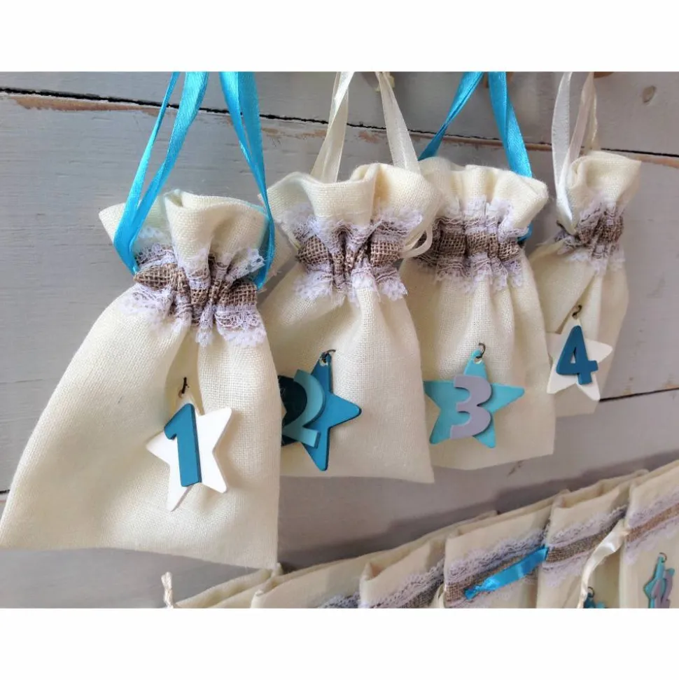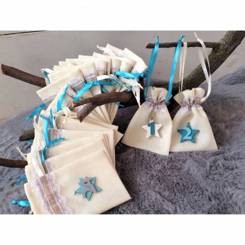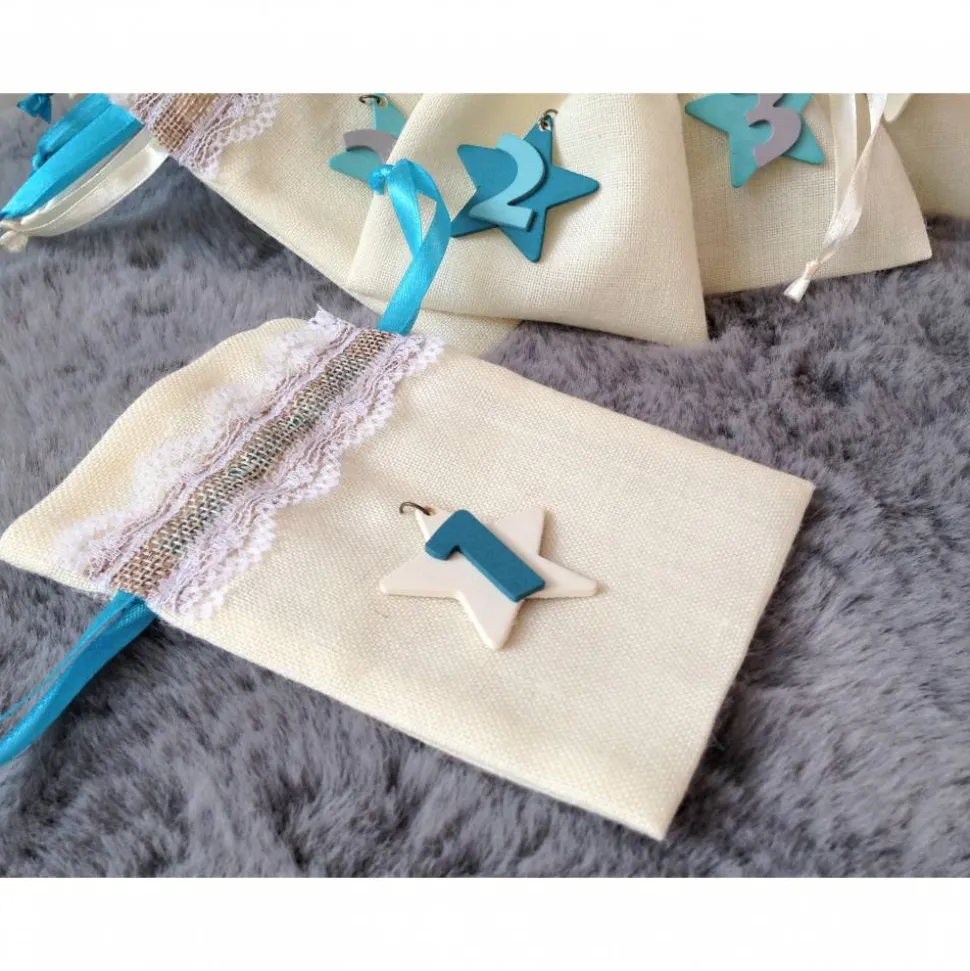 Große Sterne mit Holzzahlen in türkis und weiß, geben den Säckchen den nötigen Pfiff.