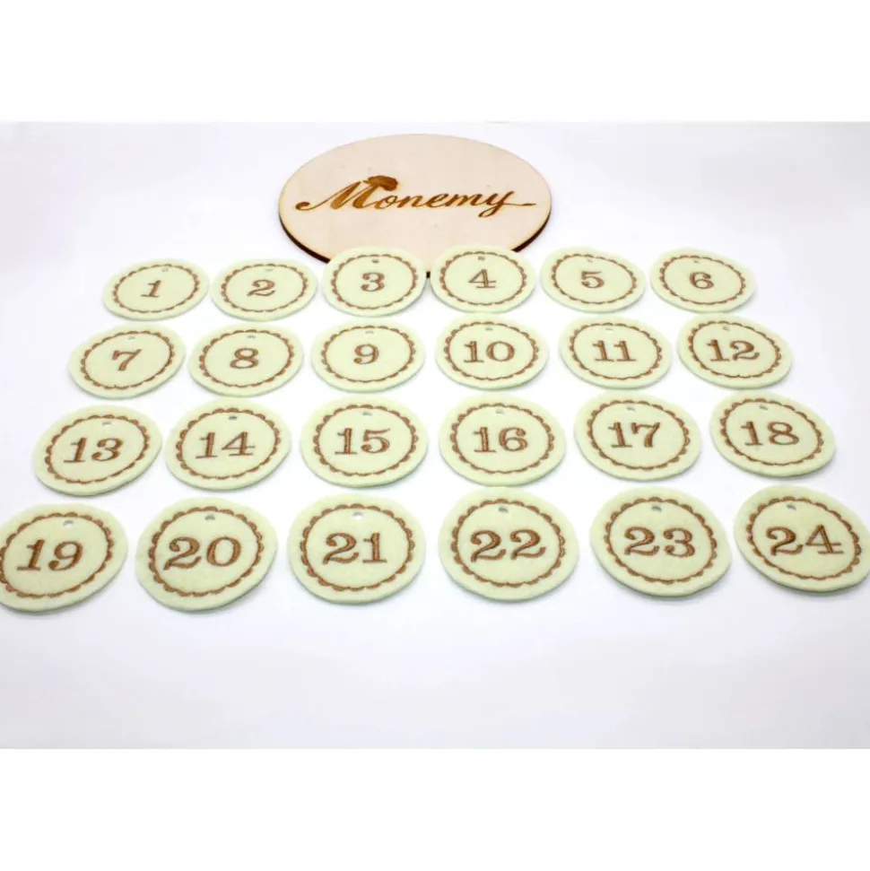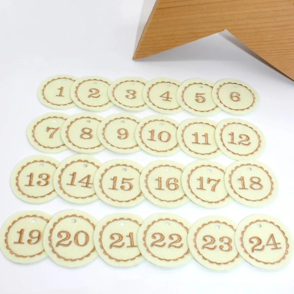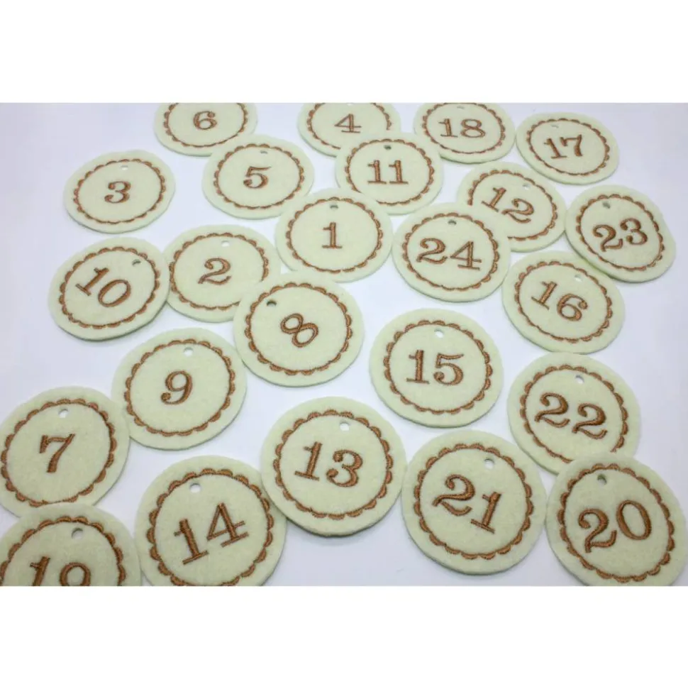 Die runden Adventskalenderzahlen wurden mit den Zahlen bestickt und bleiben daher lange erhalten. Sie lösen sich nicht einfach ab und können so mehrere Jahre genutzt werden. Die Zahlen aus Filz machen jeden Adventskalender zu etwas Besonderem und können als Anhänger an dem Säckchen, Tütchen oder kleinen Geschenken angehängt werden.