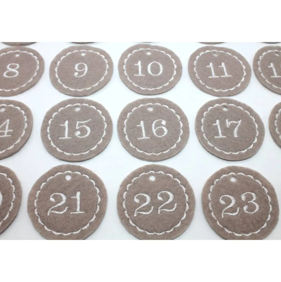 Der Filz ist taupe und die Stickfarbe ist hier weiß.