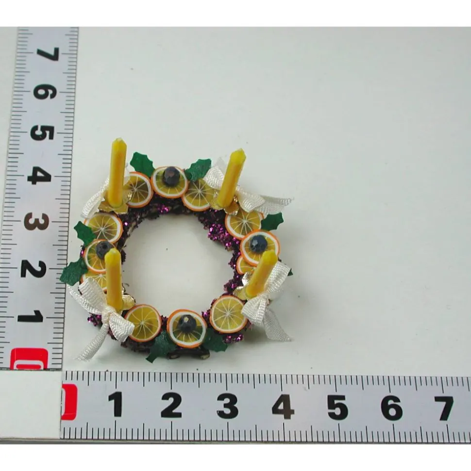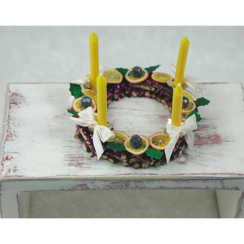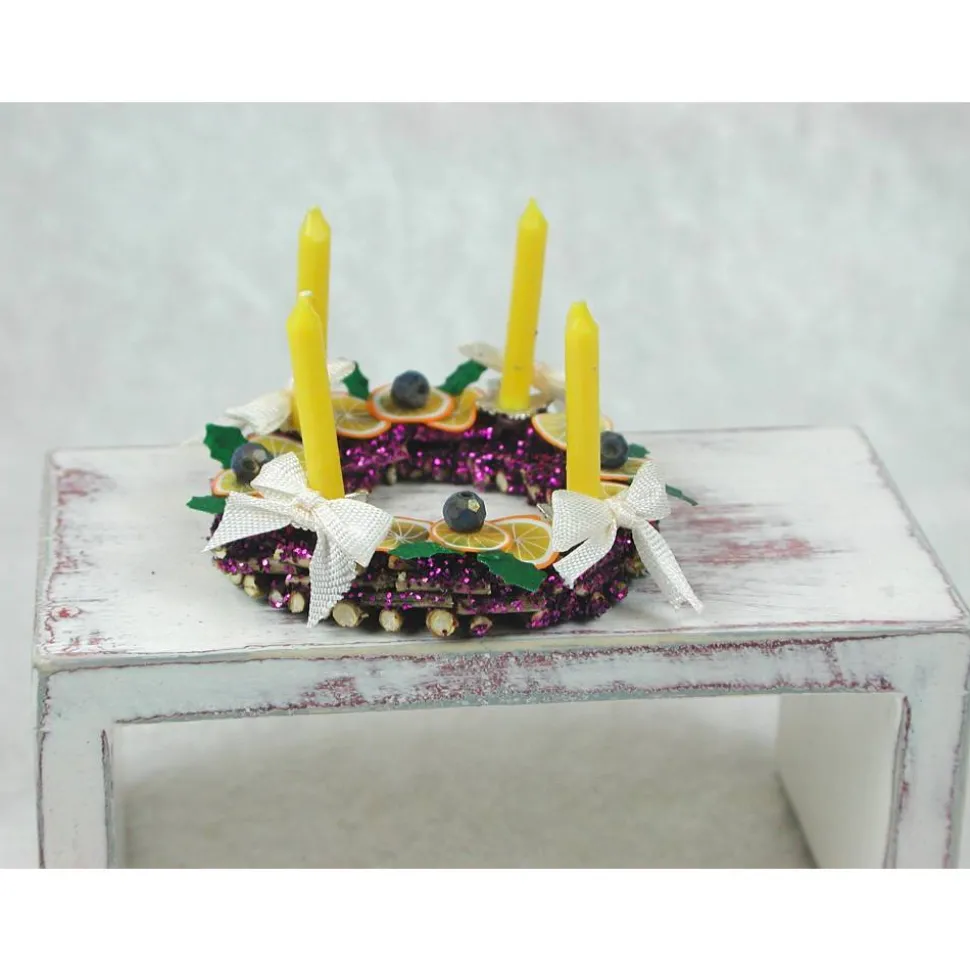 Der Holzkranz ist aus kleinen Ästchen hergestellt, die Kerzenhalter aus Metall Perlkappen und mit echten gelben Wachskerzen bestückt.