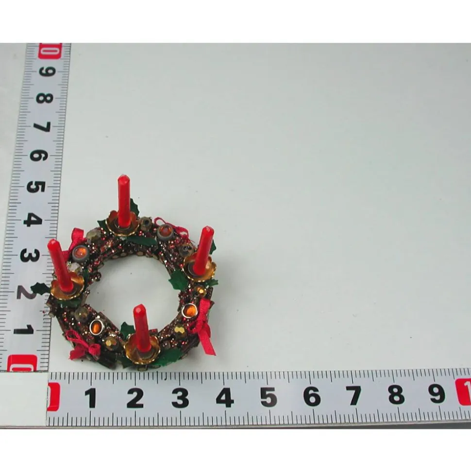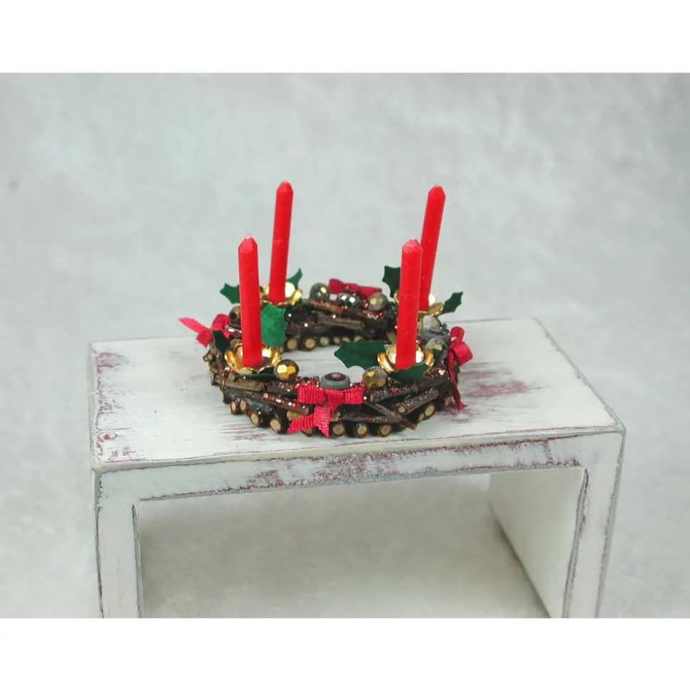 Der Holzkranz ist aus kleinen Ästchen hergestellt, die Kerzenhalter aus Metall Perlkappen und mit echten gelben Wachskerzen bestückt.