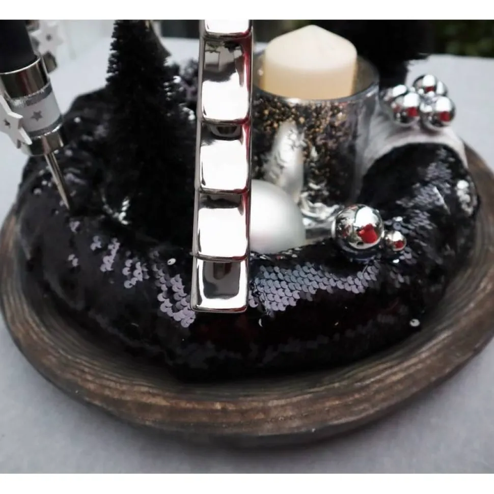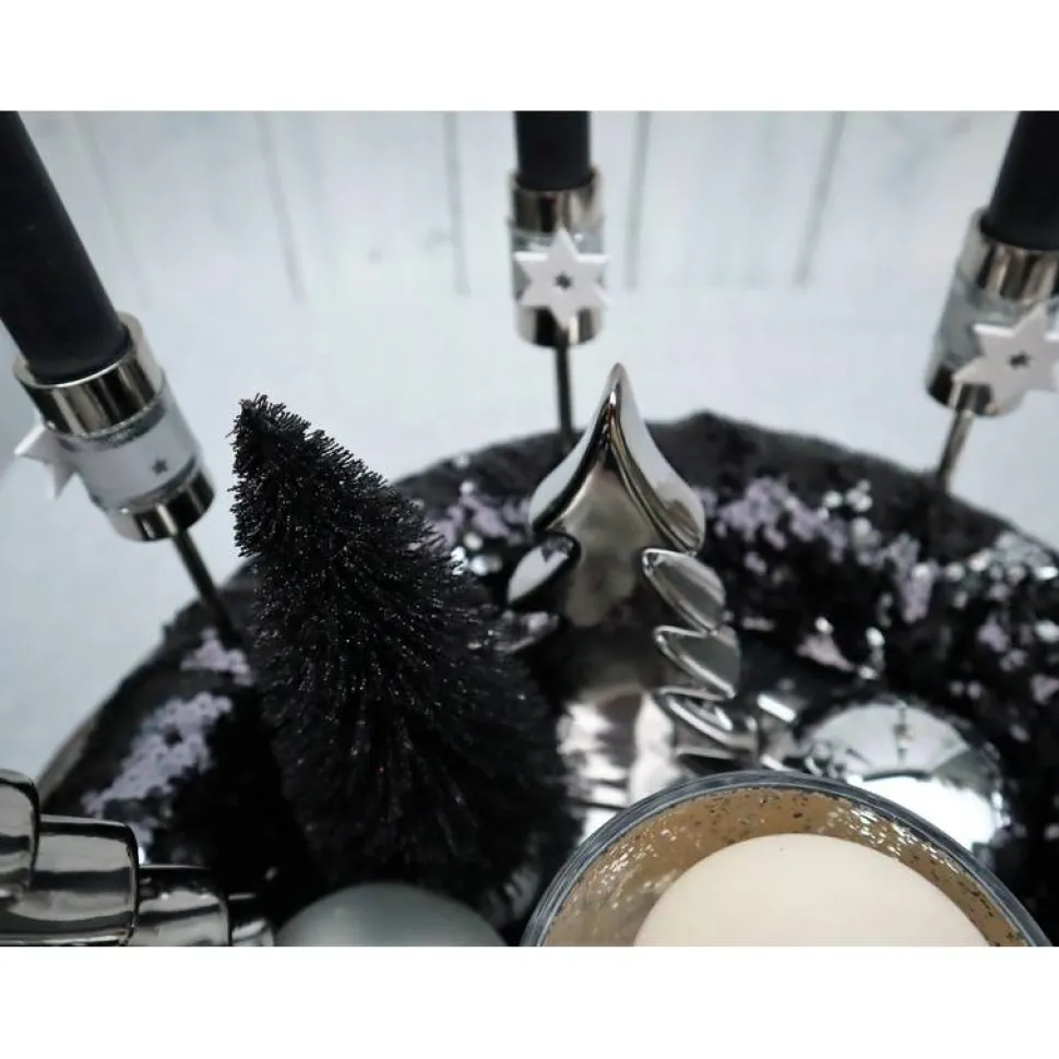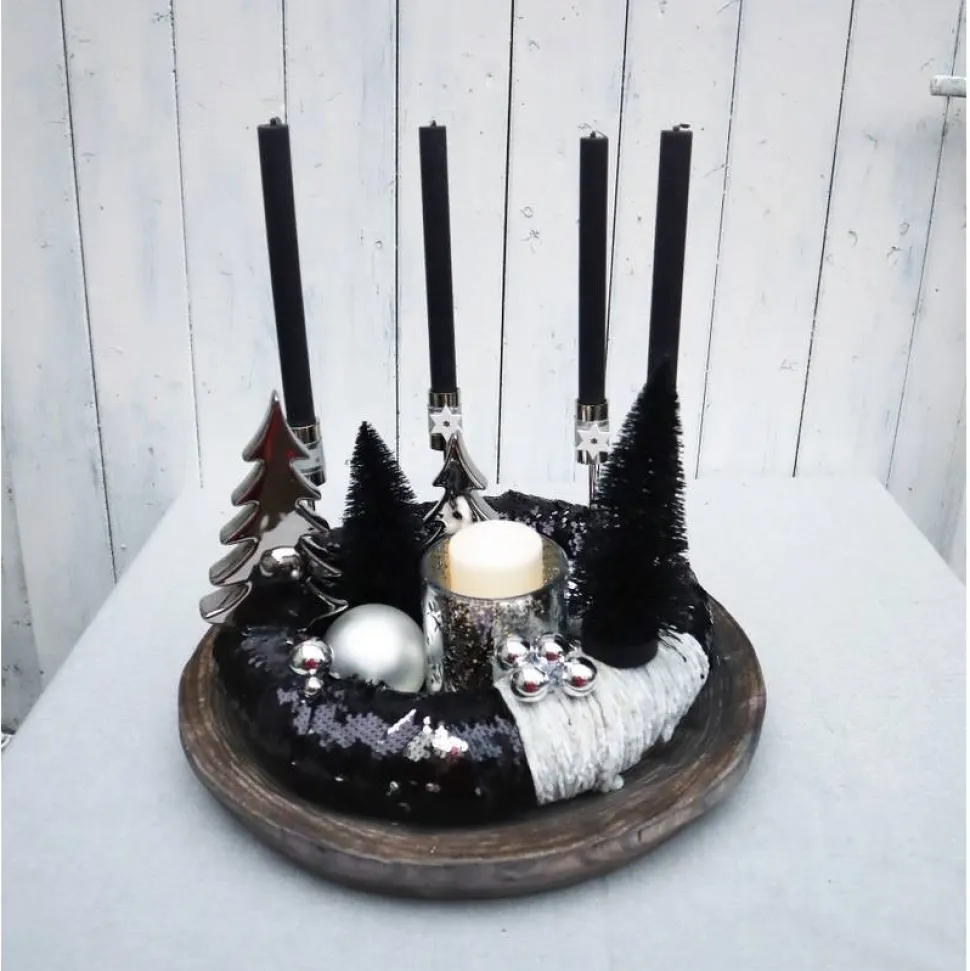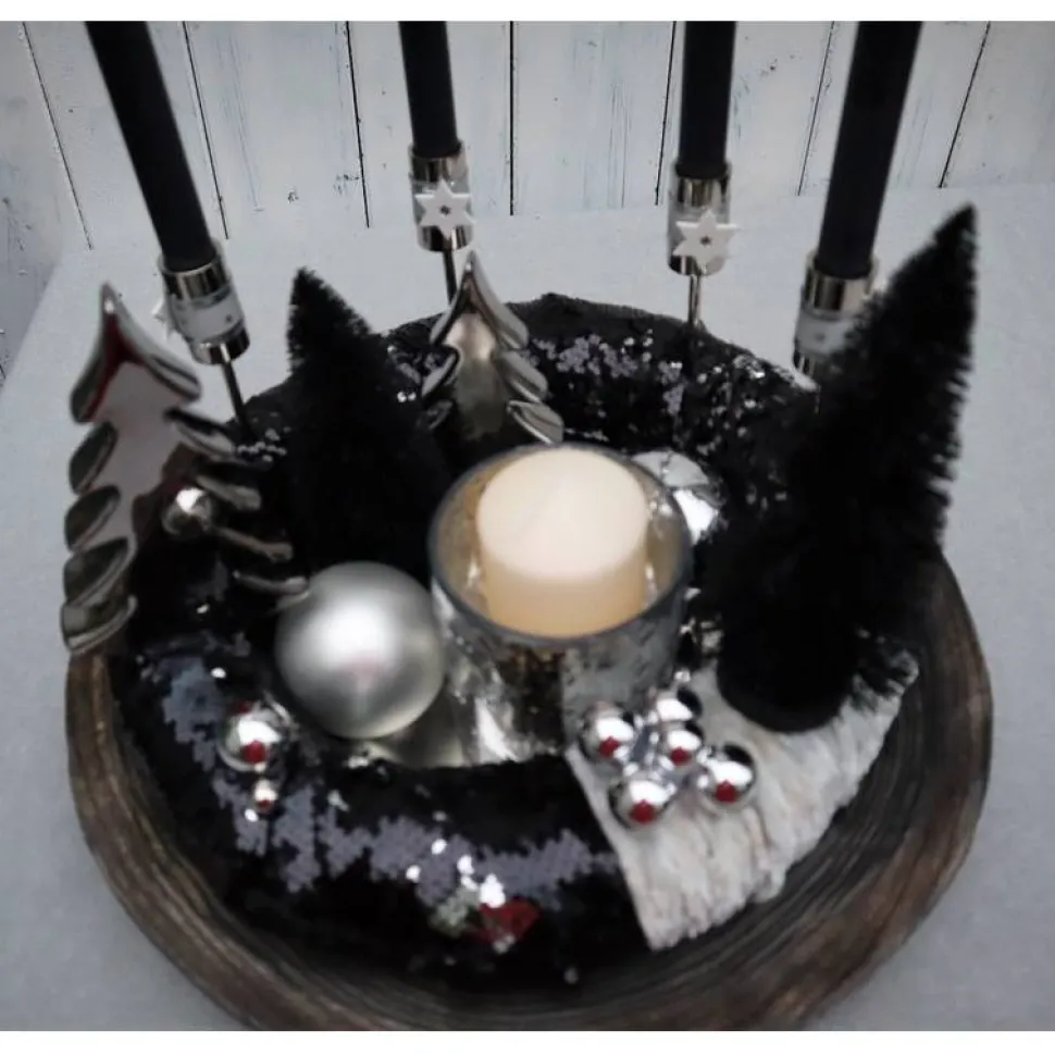 In den „Pailettenkranz“ habe ich hochwertige, stabile Stabkerzenhalter eingesetzt. Dekoriert wurde das Ganze mit modernen Tannenbäumen in schwarz, Keramiktannenbäumen in silberfarbig hochglänzend, großen Glaskugeln, eine edlen Glaswindlicht und silberfarbigen Perlen.