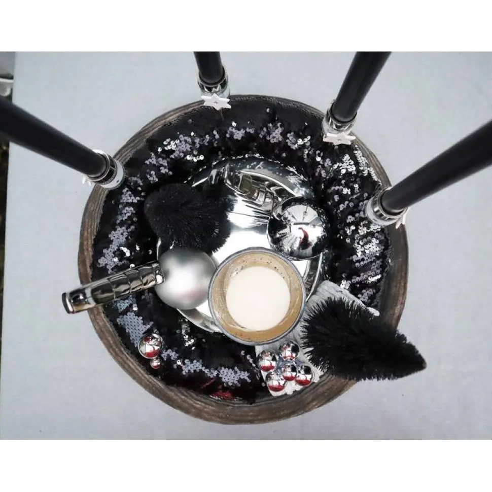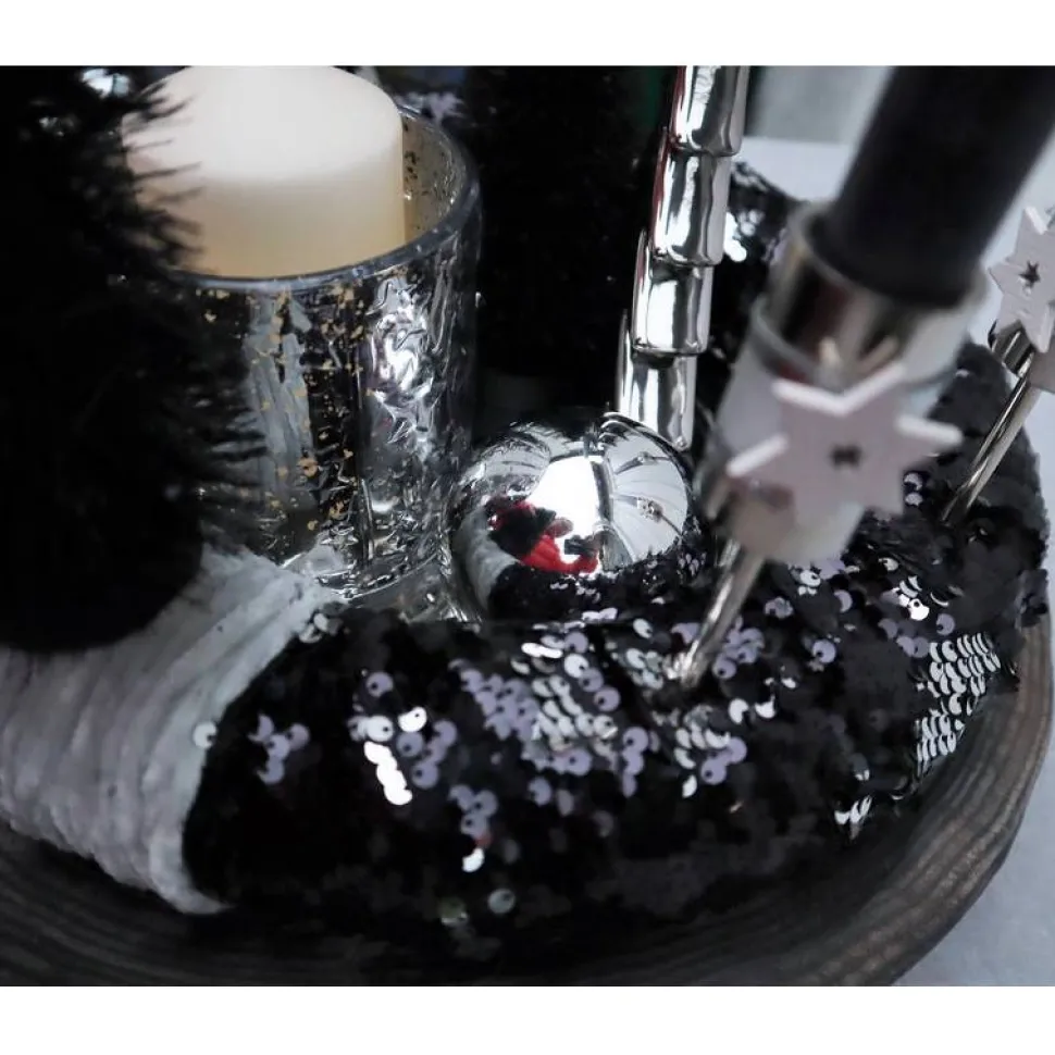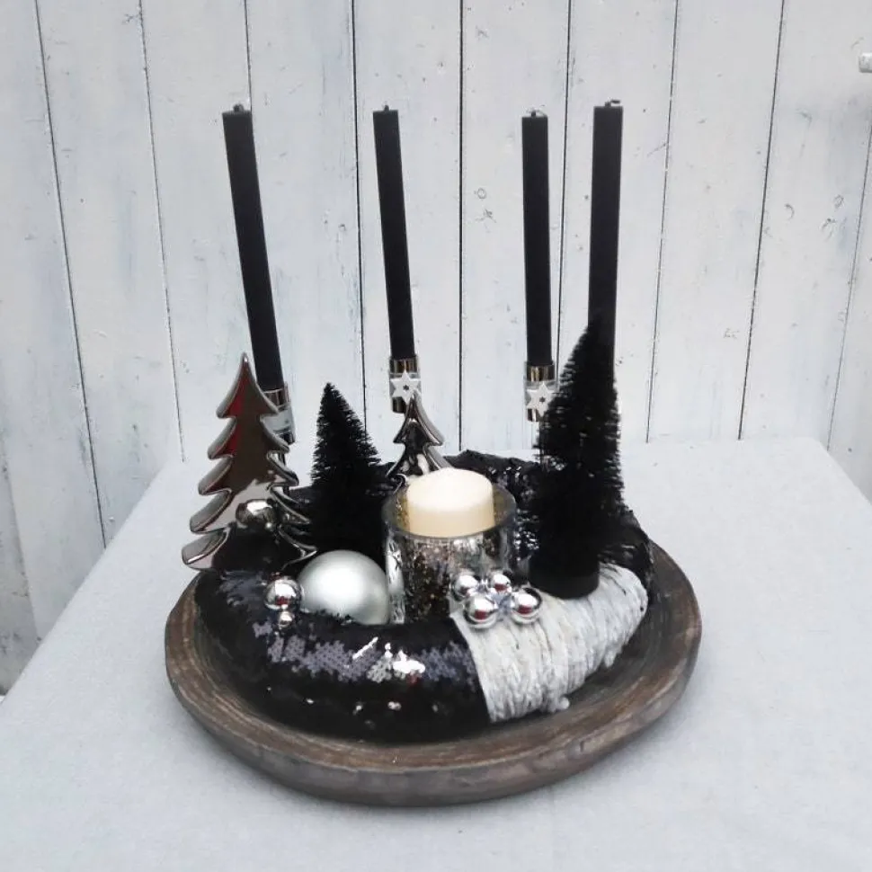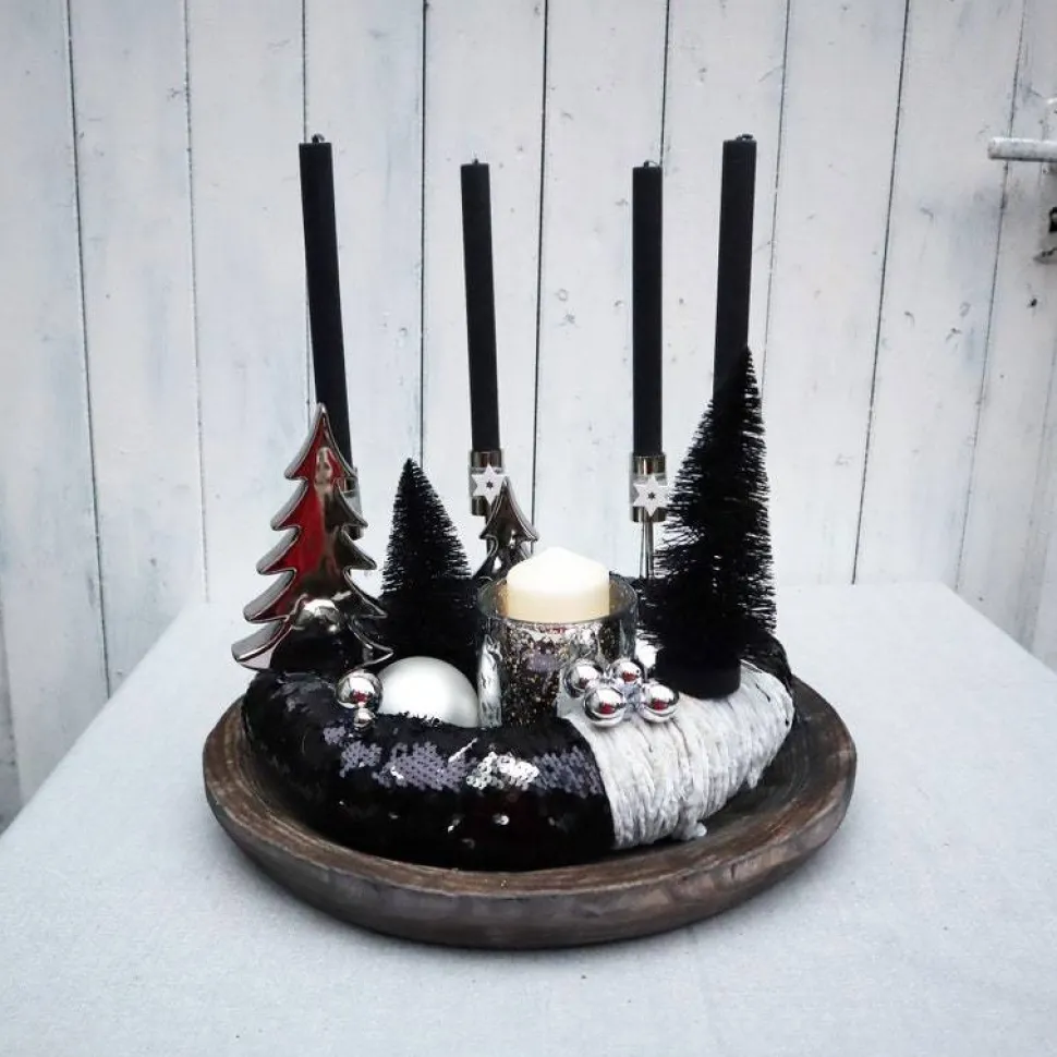 In den „Pailettenkranz“ habe ich hochwertige, stabile Stabkerzenhalter eingesetzt. Dekoriert wurde das Ganze mit modernen Tannenbäumen in schwarz, Keramiktannenbäumen in silberfarbig hochglänzend, großen Glaskugeln, eine edlen Glaswindlicht und silberfarbigen Perlen.