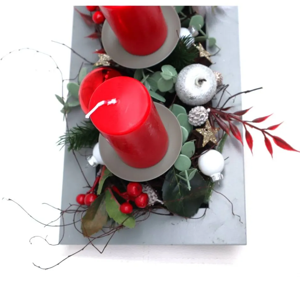 Größe: ca. 50 cm Breite,Tiefe ca. 15 cm, Höhe ca. 8 cm (ohne Kerzen)Material: Holztablett, Kerzen, künstliches Grün, weitere Dekorationen