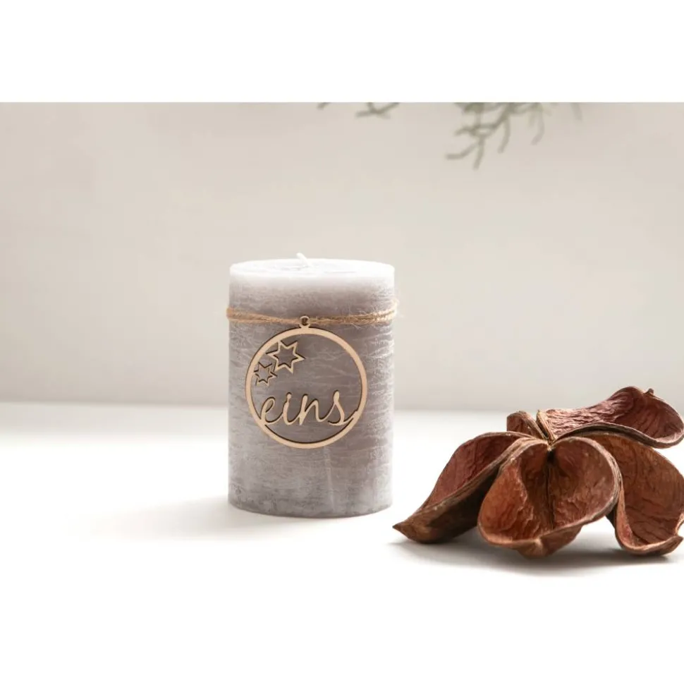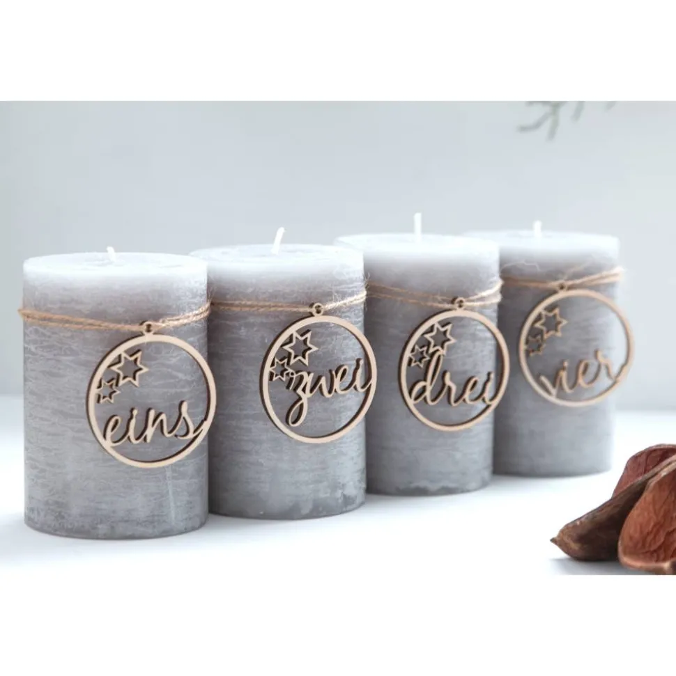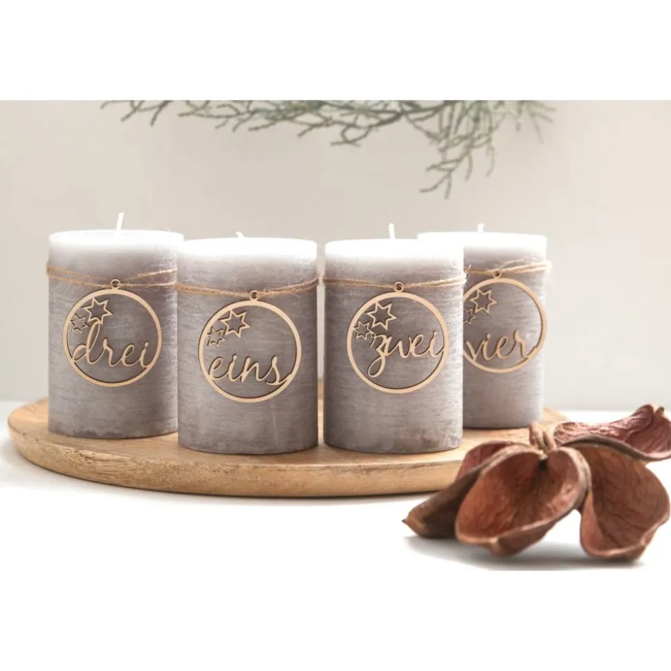 - Set mit vier runden Holzanhängern in schlichter Schreibschrift: eins, zwei, drei, vier.