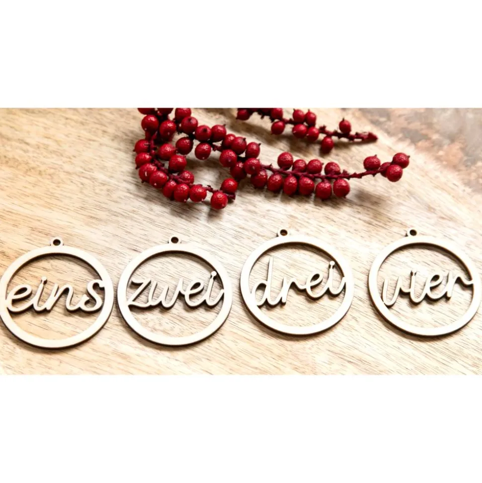 - 4 Holzzahlen (eins, zwei, drei, vier) mit kleiner Aufhänge-Öse