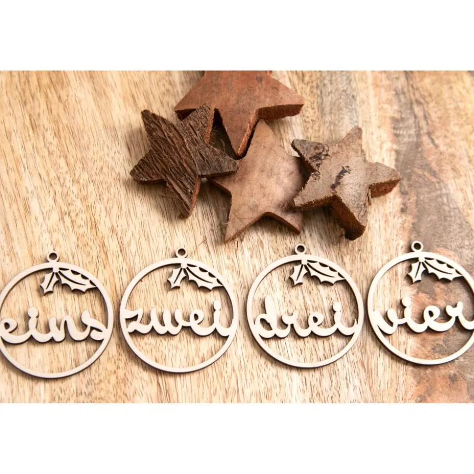 - Set mit vier runden Holzanhängern in Schreibschrift: eins, zwei, drei, vier.