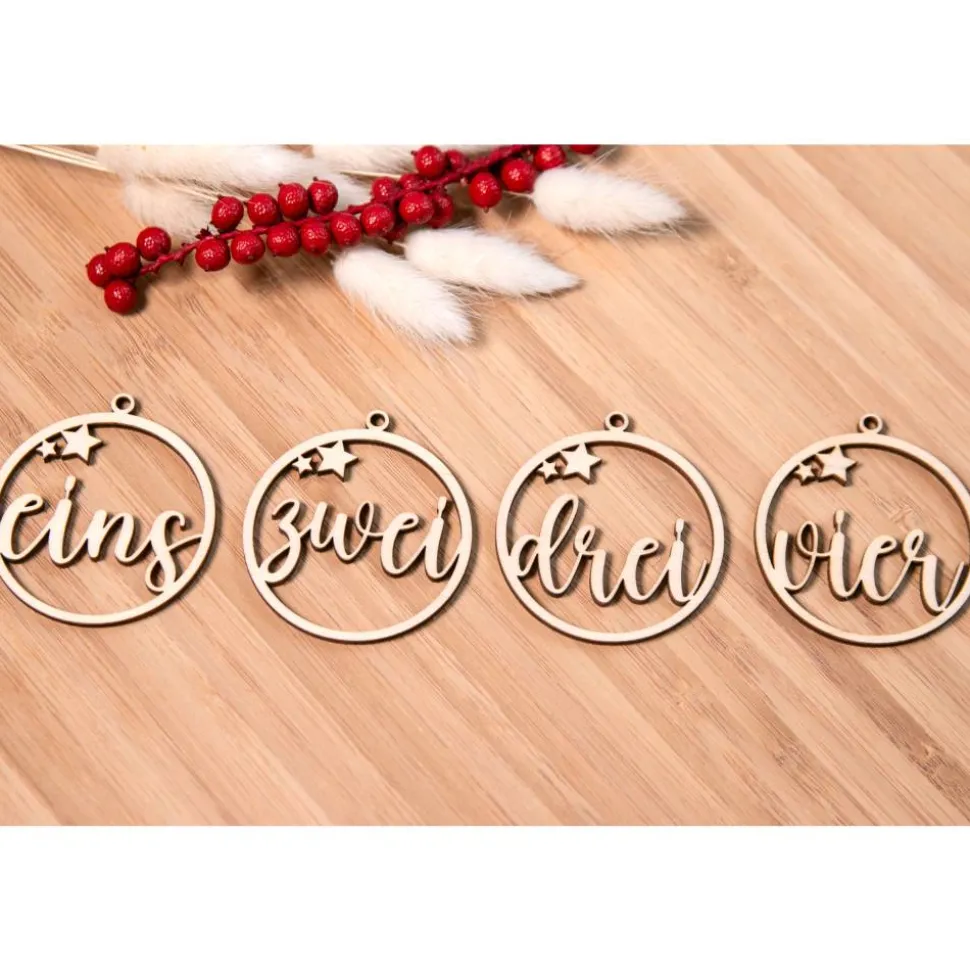 - 4 Holzzahlen in Schreibschrift mit Sternen (eins, zwei, drei, vier) mit Aufhänge-Öse.