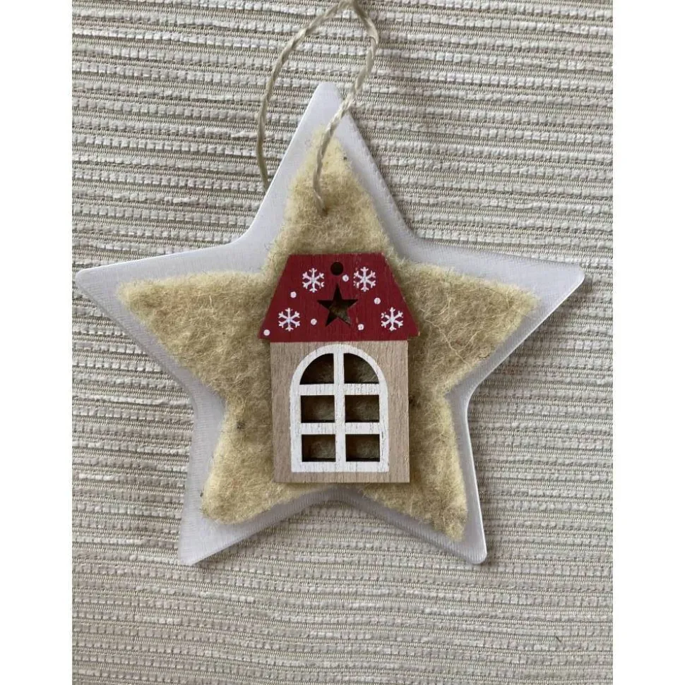 Der in transparent-weiß gedruckte 3-D-Stern nach eigenem Entwurf ist zusätzlich mit Dekorations-Elementen ausgestaltet. Wahlweise ist das Motiv (Holzhaus-Anhänger mit unterschiedlichen Farben) auf kräftig-rotem Filz oder creme-gelb-farbener Schafwolle aufgebracht. Die Aufhängung ist in den 3-D-Druck integriert.