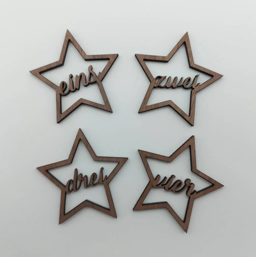 Geliefert wir ein 4er Zahlenset im Sterne Design: eins (1), zwei (2), drei (3), vier (4)