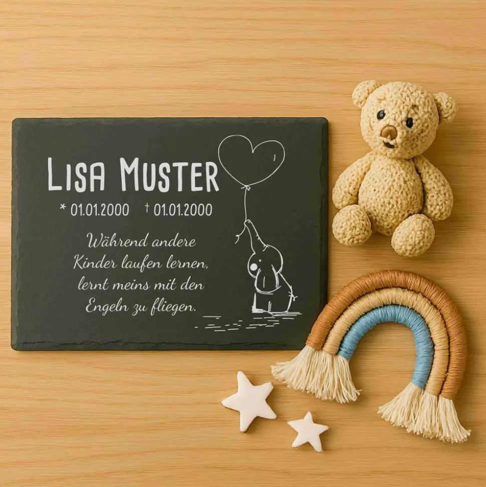 Persönliches Erinnerungsstück: Die langlebige Gravur macht die Schieferplatte zum idealen Grabstein oder Gedenkstein für dein Sternenkind. Deine Wünsche stehen bei uns im Mittelpunkt – wir setzen jeden Auftrag mit viel Herz und Sorgfalt um.