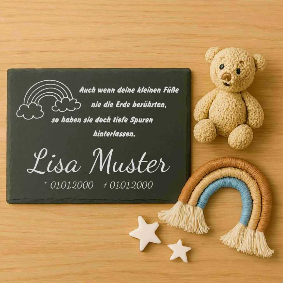 Persönliches Erinnerungsstück: Die langlebige Gravur macht die Schieferplatte zum idealen Grabstein oder Gedenkstein für dein Sternenkind. Deine Wünsche stehen bei uns im Mittelpunkt – wir setzen jeden Auftrag mit viel Herz und Sorgfalt um.