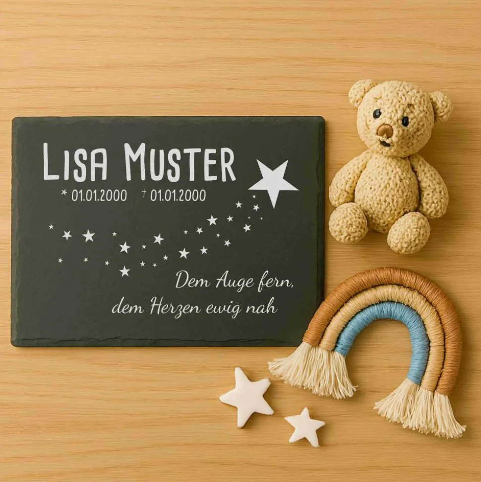 Andenken an Sternenkinder – Schiefertafel mit Namen, Datum und süßen Motiven – Erinnerung für Zuhause oder Garten