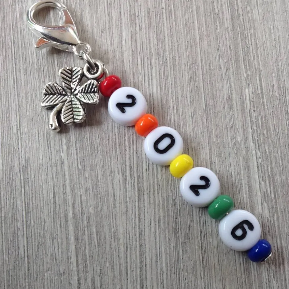 In diesem Anhänger sind bunte Rocailles (Durchmesser 4,5 mm), Zahlenperlen aus Kunststoff (Durchmesser ca 7mm) sowie ein kleines Kleeblatt aus Metall verarbeitet. Durch den praktischen Karabiner (Höhe ca 16mm) kannst du ihn ganz einfach an Taschen, Mäppchen, Schlüsselringen oder Ketten befestigen. Die Gesamtlänge des Anhängers beträgt 6,5 cm.