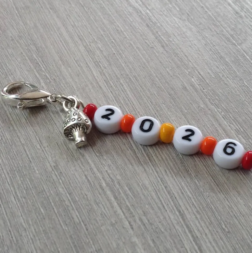 Verarbeitet sind hochwertige Rocailles in Rottönen (Durchmesser 4,5 mm), Zahlenperlen aus Kunststoff (Durchmesser ca 7mm) sowie ein kleiner Pilz aus Metall (Höhe 1 cm). Der praktische Karabiner (Höhe ca 16mm) ermöglicht dir eine einfache Befestigung an Taschen, Mäppchen, Schlüsselringen oder Ketten. Die Gesamtlänge des Anhängers beträgt 6,5 cm.