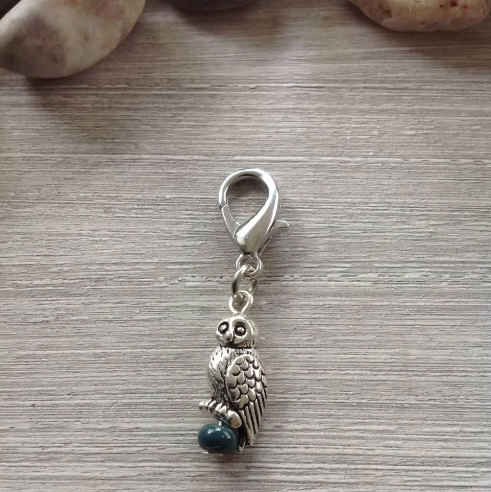 Die kleine, ca 1,3 cm hohe Eule aus Metall ’sitzt‘ auf einer kleinen Glasperle ( Rocaille / Durchmesser 4,5 mm ). Sie ist mit einer Metallöse an dem 1,6 cm hohen Karabiner befestigt. Mit Hilfe des Karabiners lässt sie sich bequem an Taschen, Mäppchen, Ketten etc befestigen. Die Gesamtlänge des Anhänger beträgt ca 3,7 cm