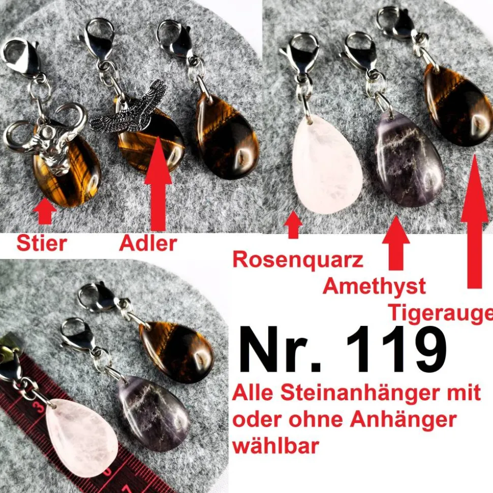 Die Längen der verschiedenen Anhänger sind auf dem Bild (Masband in cm) erkennbar.