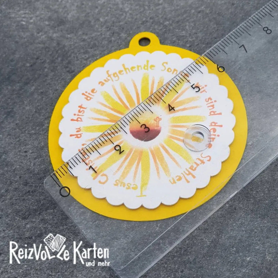 Die liebevoll gestalteten Anhänger mit dem inspirierenden Spruch „Jesus Christus, du bist die aufgehende Sonne, wir sind deine Strahlen“ sind perfekt für die Kommunion und andere christliche Feste. Sie haben einen Durchmesser von ca. 6 cm und bestehen aus hochwertiger Pappe (300 g/m²).