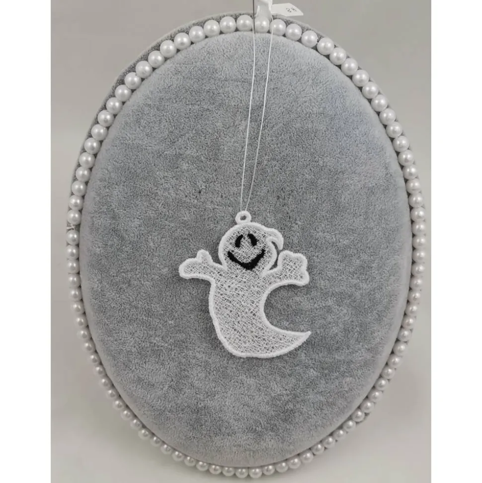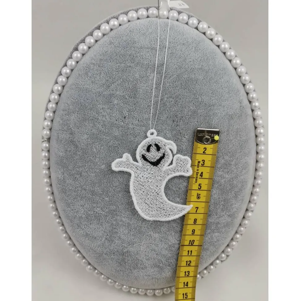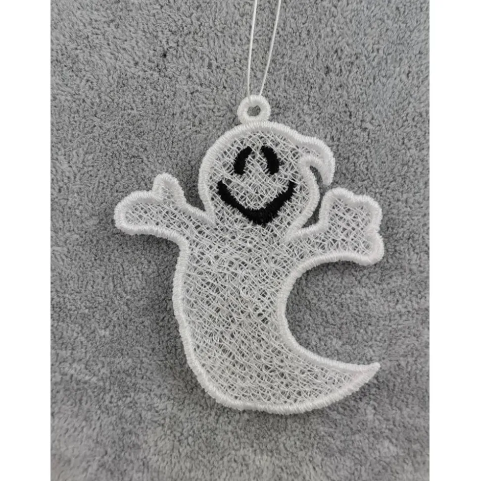 Lace Produkte werden mit einer Stickmaschine und Stickgarn auf wasserlöslichem Vlies gestickt. Nach dem Stickvorgang wird das Vlies ausgewaschen, sodass letztendlich nur die Stickerei übrig bleibt.