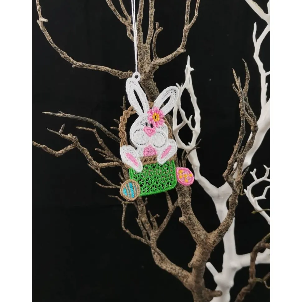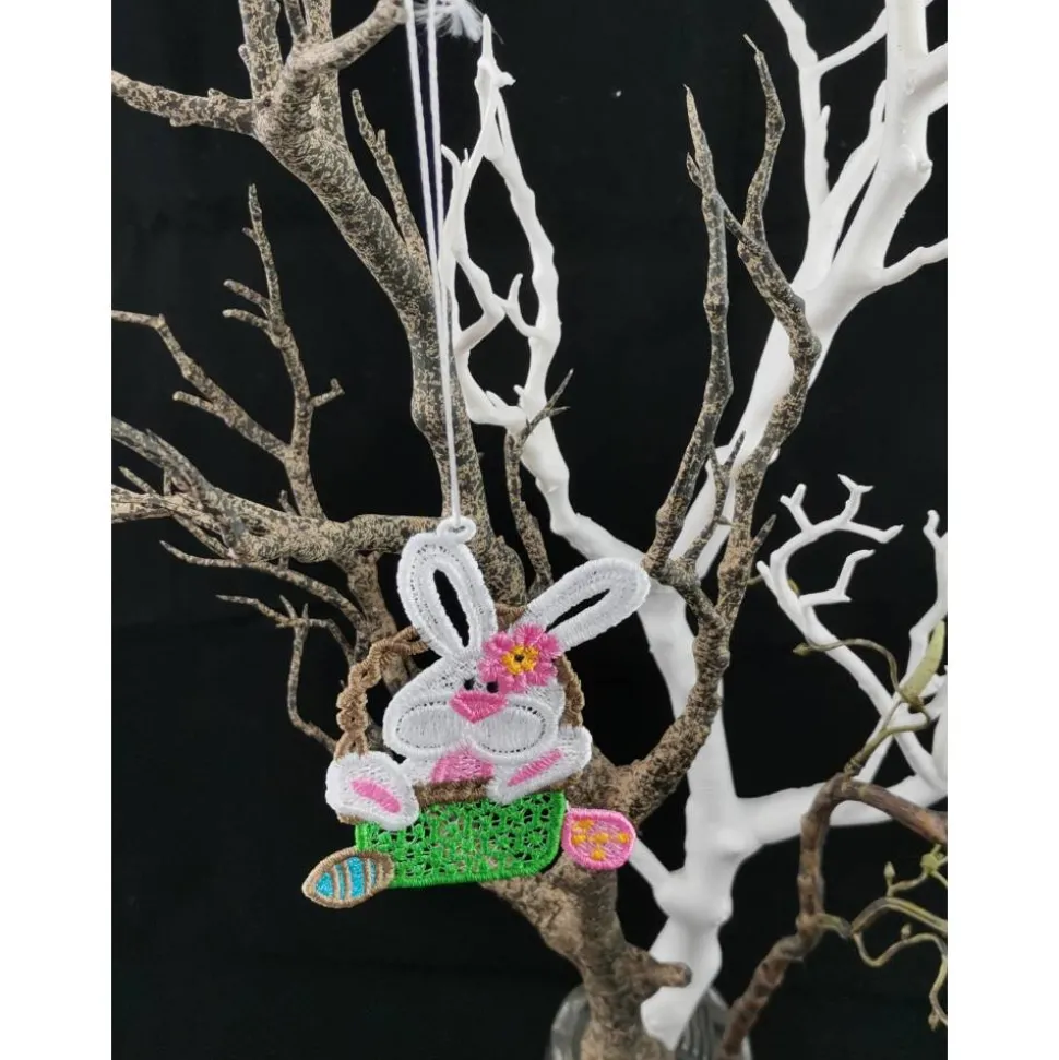 Lace Produkte werden mit einer Stickmaschine und Stickgarn auf wasserlöslichem Vlies gestickt. Nach dem Stickvorgang wird das Vlies ausgewaschen, sodass letztendlich nur die Stickerei übrig bleibt.