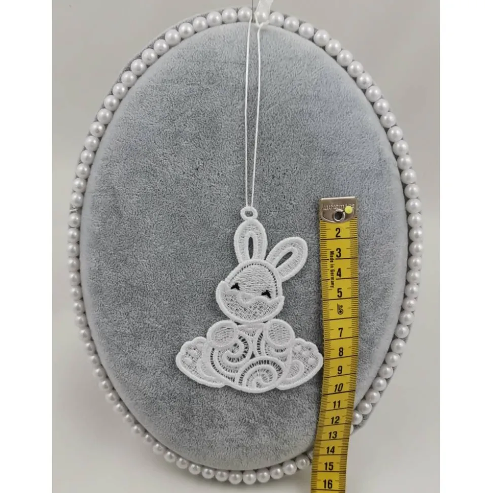 Lace Produkte werden mit einer Stickmaschine und Stickgarn auf wasserlöslichem Vlies gestickt. Nach dem Stickvorgang wird das Vlies ausgewaschen, sodass letztendlich nur die Stickerei übrig bleibt.